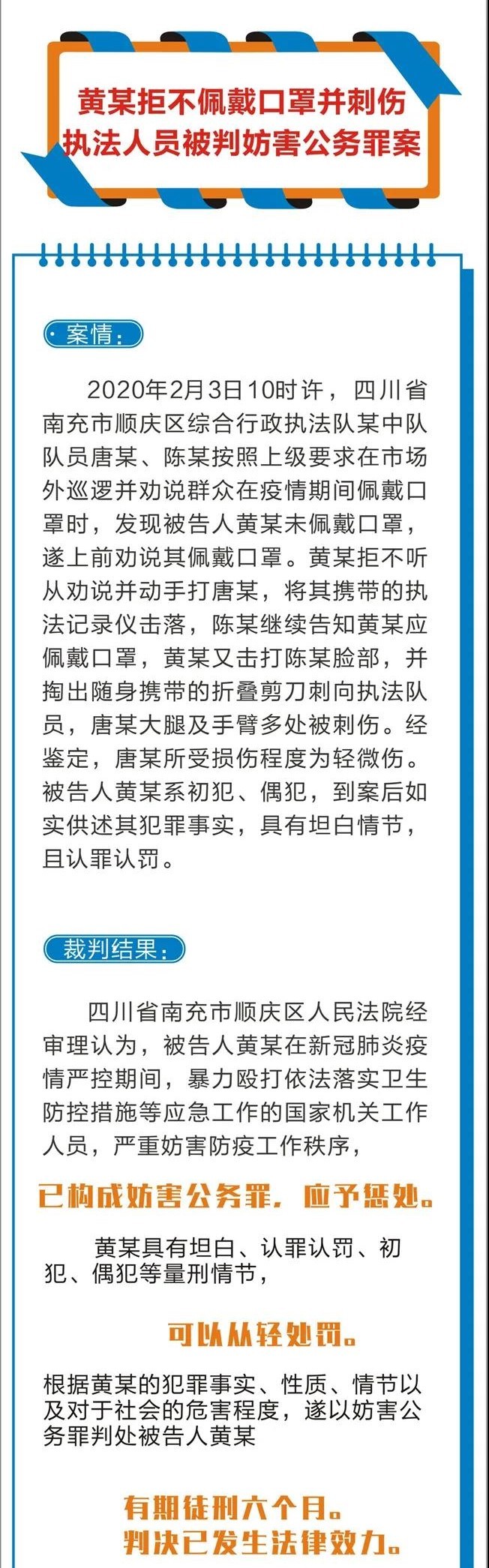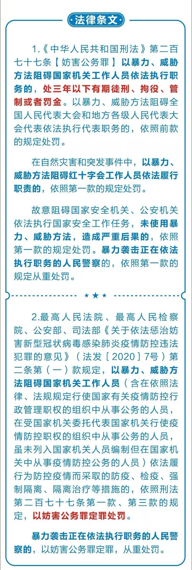 根据媒体公开报道,新冠肺炎疫情发生以来,全国各地发生多起因为行为人不佩戴口罩或者其他不配合执法而与公务人员发生冲突的案件。疫情期间,妨害公务会受到什么样的处罚?四川在线记者梳理了妨害公务的典型案例和相关法条,希望广大群众以案例为鉴、以案例戒,增强法治意识,依法支持和配合疫情防控工作。