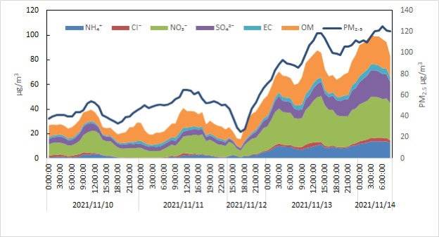 11月10日-14日成都市PM2.5组分变化趋势图(数据来源:大气科研实验室)