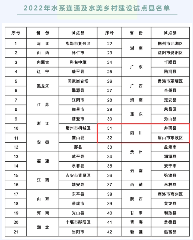 11月15日,四川在线记者从中国水利公众号获悉,根据《水利部办公厅 财政部办公厅关于开展2022年水系连通及水美乡村建设试点的通知》有关要求,水利部、财政部委托第三方组织技术专家,对各地报送的水系连通及水美乡村建设试点县实施方案开展了评审,择优确定了纳入中央财政支持的2022年水系连通及水美乡村建设试点县名单。