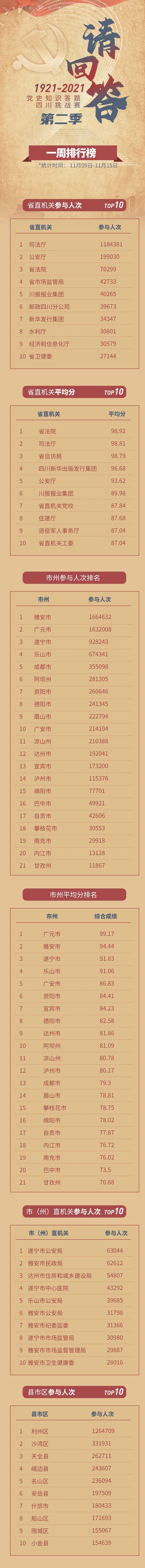自第二季上线以来,“请回答1921—2021”党史知识答题四川挑战赛已覆盖全省115个省直机关、21个市州、203个区市县(含经开区、高新区)、1222个市(州)直机关,答题人次为923万人次,活动阅读量达到2796万人次。