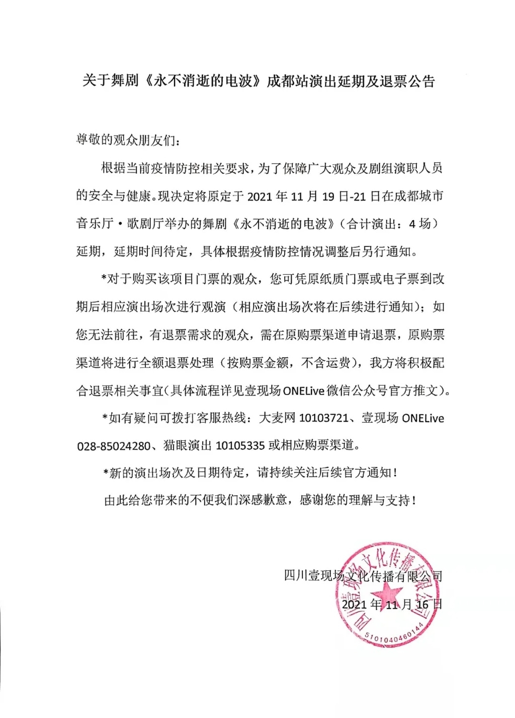 11月16日,记者从四川壹现场文化传播有限公司获悉,原定于2021年11月19日-21日在成都城市音乐厅·歌剧厅举办的舞剧《永不消逝的电波》(合计演出:4场)延期,延期时间待定,具体根据疫情防控情况调整后另行通知,该剧也是2021全国优秀舞剧邀请展演活动的剧目之一。