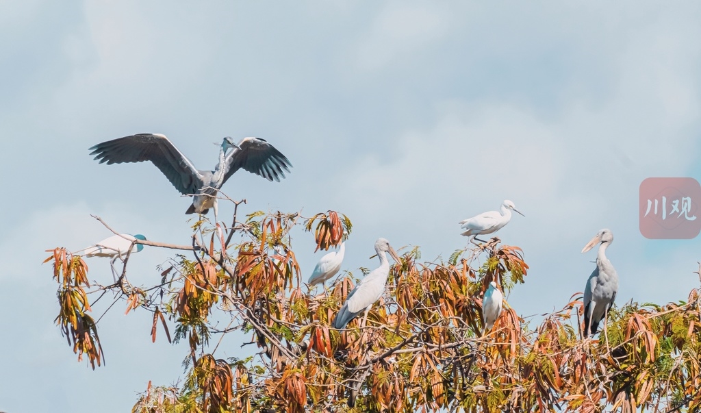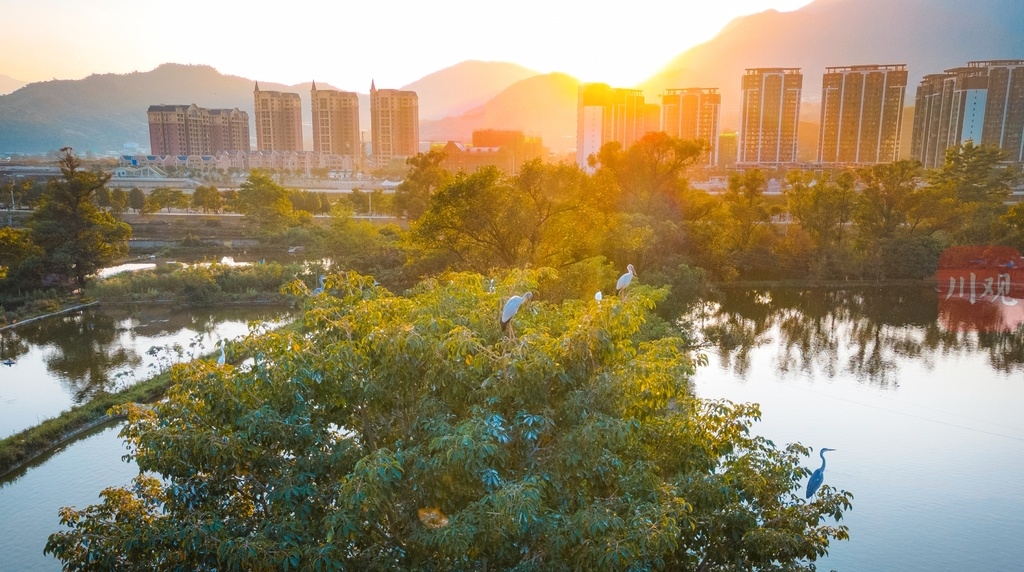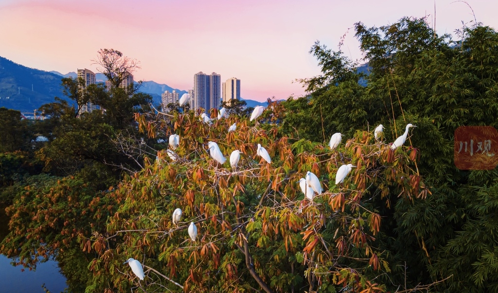 11月14日,在米易县城南湿地公园内,大群白鹭翩翩飞舞,充满诗情画意。夕阳西下,白鹭归巢,为冬日点缀出一派生机盎然的和谐景象。白鹭对栖息地环境极为挑剔,素有“水质状况监测鸟”的美誉,是国家二级重点保护动物,米易具有得天独厚、无可复制的海拔高度、温度、湿度、洁净度、优产度、和谐度“六度”禀赋,冬暖夏凉,生态优美,引来白鹭在这里繁衍生息“安家落户”。
