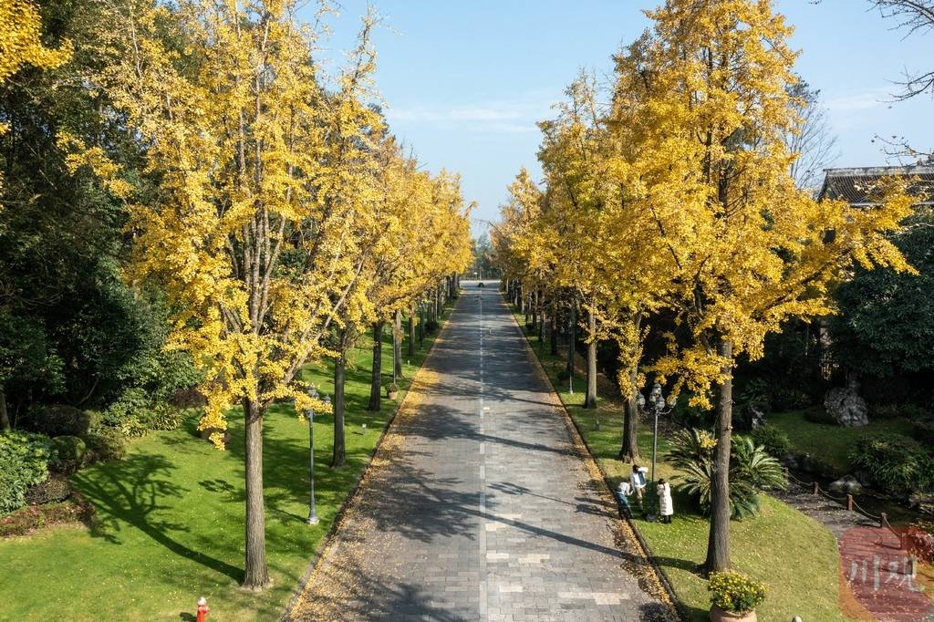 在距离市区约40分钟车程的郫都区今日田园,银杏已成金黄色,飘洒下的落叶,顺着风在地面卷动,铺成一地锦绣。