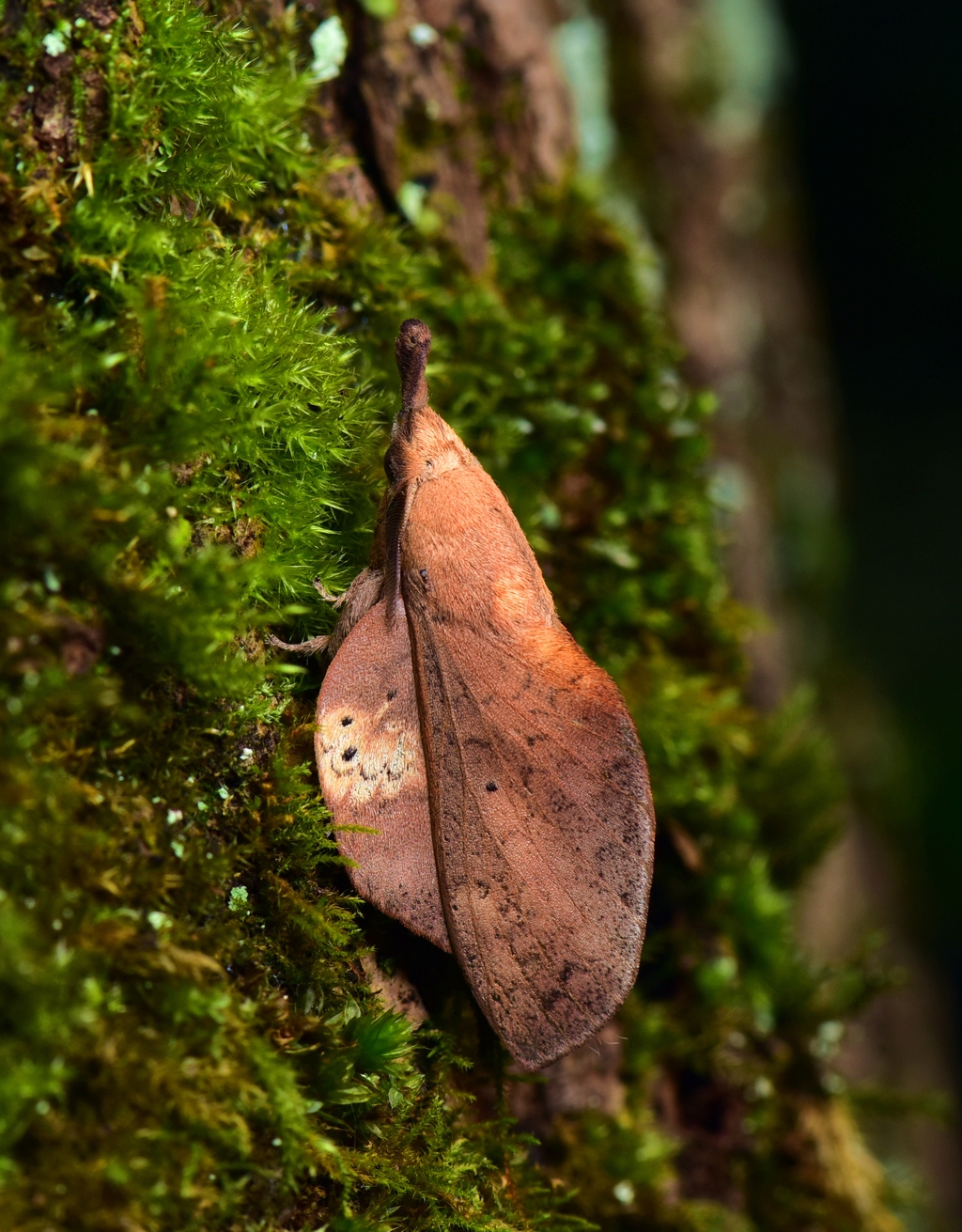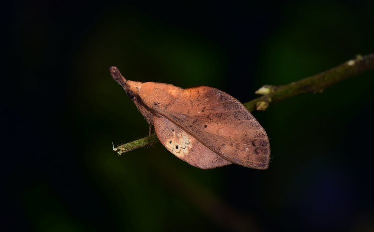 “绿斑枯叶蛾”拟态枯叶似乎更为细心,无论是叶柄的逼真还是叶脉上点缀的暇疵、虫眼……,应有尽有。不仔细辨认,谁知道是一只蛾呢?!