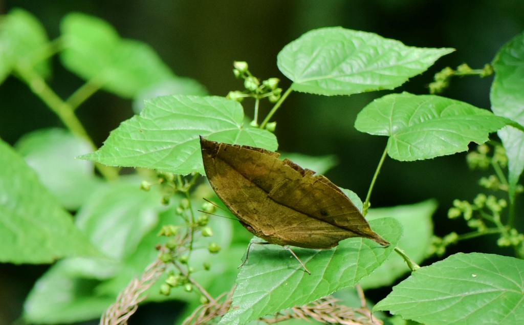 当一阵清凉的风吹起落叶,在飞舞的叶子里,也许有一些两片连在一起的小叶子,逆风而行,忽上忽下地飞,转瞬没了踪影。如果你凑上去想看个究竟,你会惊奇的发现那片褐色的“叶片”竟然张开来,露出略浅的背面。哦,原来是一只枯叶蝶。