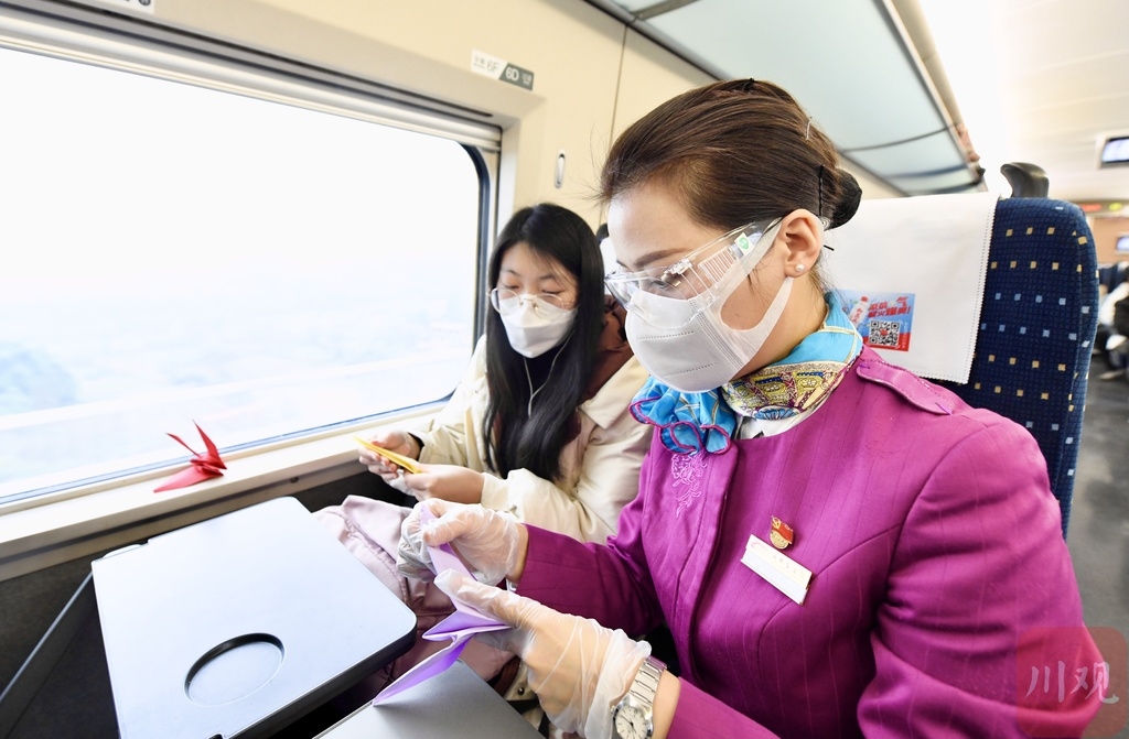 成都客运段东线动车队工作人员与旅客开展“世界问候日”互动。