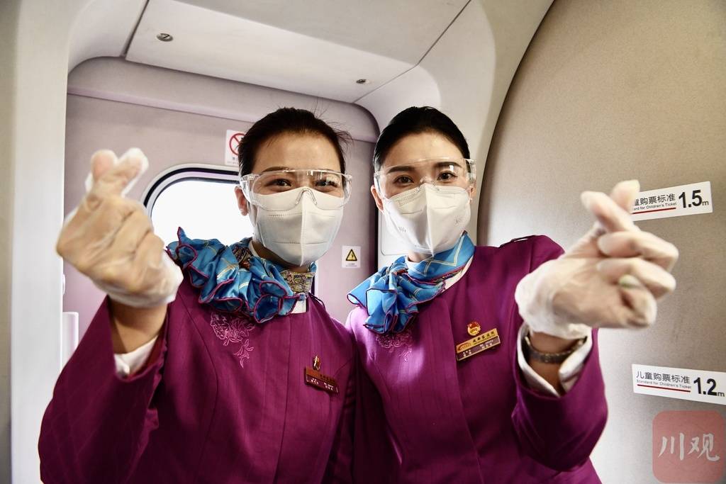 成都客运段东线动车队工作人员在列车上展示问候语。