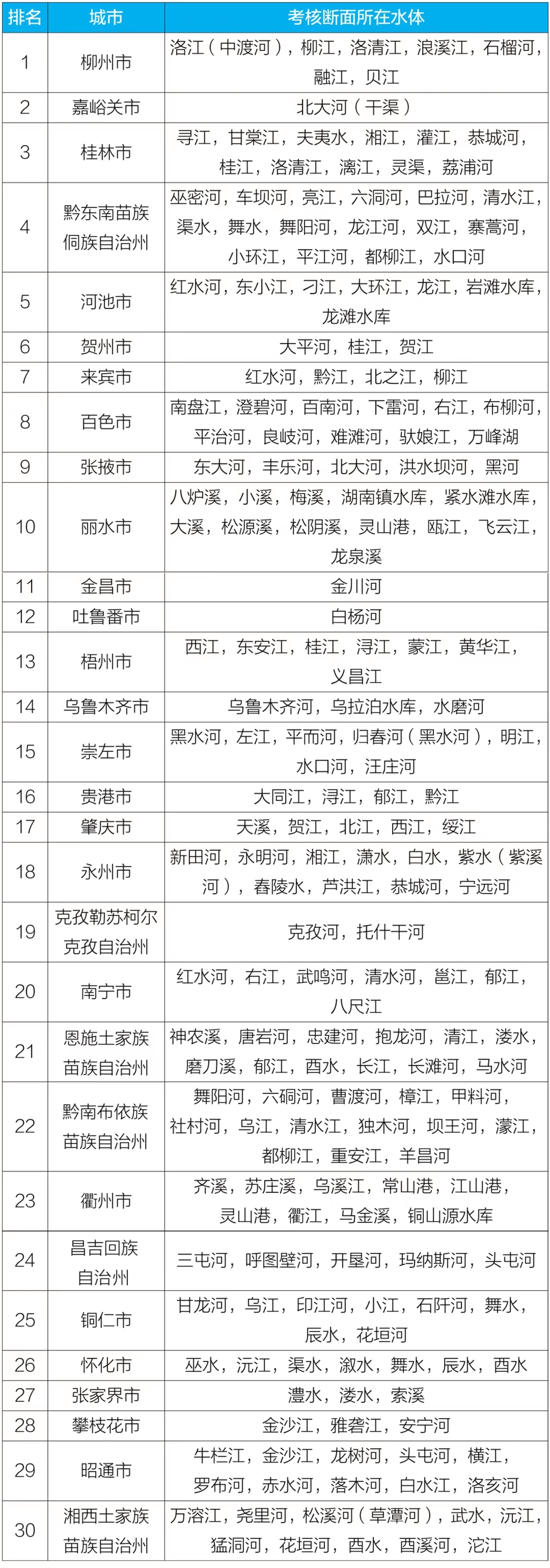 从2019年5月起,除了“大气排名”,生态环境部开始发布一个新的“水质排名”,即对全国地级及以上城市的地表水考核断面的水环境质量以及变化情况进行排名,此项排名共涉及333个城市。