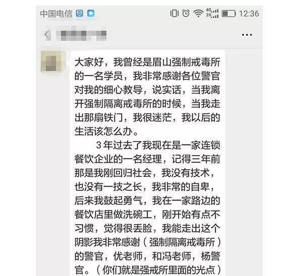 29岁的郝某,从小父母离异,随母亲生活。中专毕业后参军,退役后到国外经营养殖业,赚到了第一桶金,2014年初,在朋友的怂恿开始吸食冰毒。痛心疾首的母亲向公安机关举报,民警在家将其抓获,送至省眉山所强制隔离戒毒。在所内,郝某积极戒治,参加了餐饮烹调等就业培训。出所后,郝某进入一家连锁餐饮企业工作,并一直与戒毒所民警保持联系。在出现心理波动时,民警及时给予一些指导性建议。现在,郝某已成长为该连锁餐饮企业的经理。