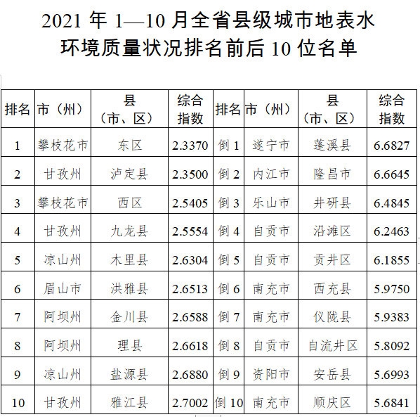 县级城市排名情况方面,1-10月,183个县级城市地表水环境质量较好的前10名依次为攀枝花市东区、泸定县、攀枝花市西区、九龙县、木里县、洪雅县、金川县、理县、盐源县、雅江县;地表水环境质量较差的后10名依次为蓬溪县、隆昌市、井研县、自贡市沿滩区、自贡市贡井区、西充县、仪陇县、自贡市自流井区、安岳县、南充市顺庆区。