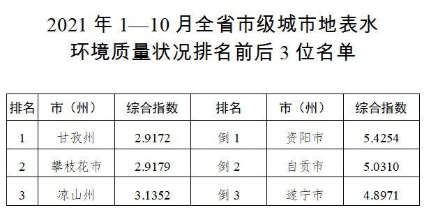 11月25日,四川省生态环境厅召开新闻发布会,会上通报了今年1-10月全省地表水质量排名情况。根据通报,今年1-10月,四川21个市级城市地表水环境质量较好的前3名依次为甘孜州、攀枝花市、凉山州,地表水环境质量较差的后3名依次为资阳市、自贡市、遂宁市。