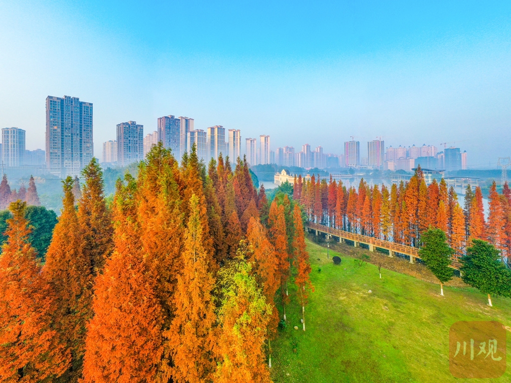 11月25日,成都市青白江区凤凰湖湿地公园晨雾弥漫,杉树林与城市建筑在雾气中若隐若现,幻如仙境,构成一幅美丽的生态画卷。