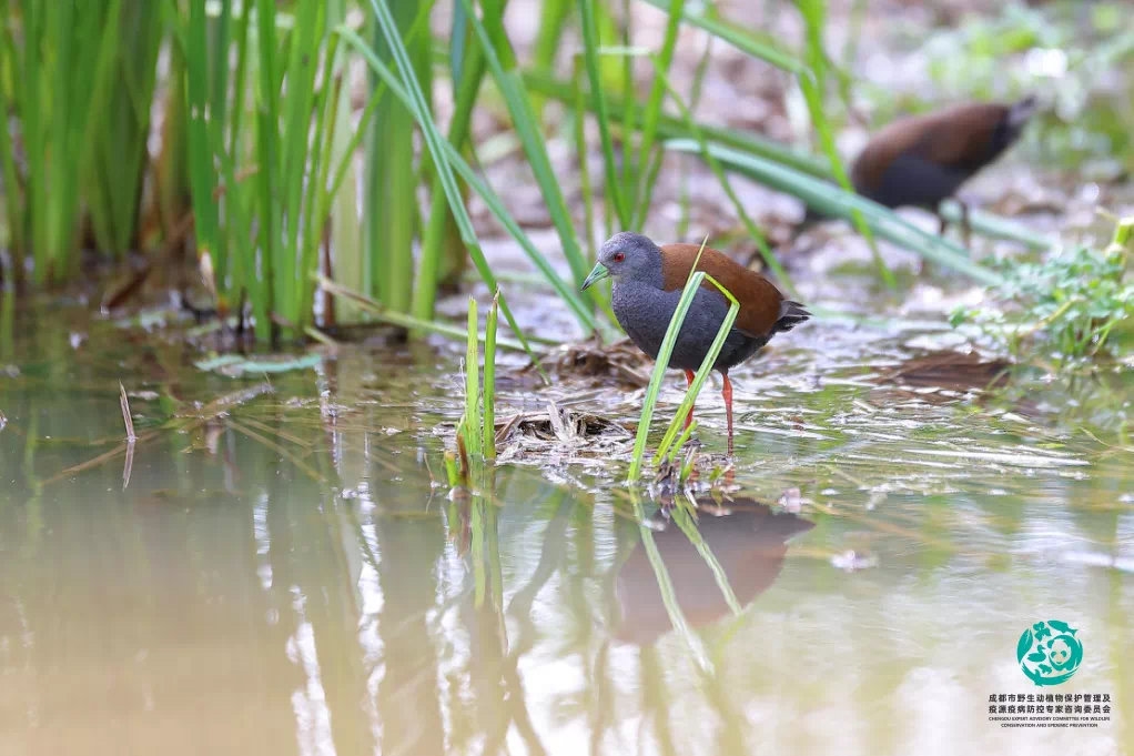棕背田鸡,鹤形目秧鸡科。是中等体型的秧鸡,头、颈、腹部为烟灰色,背部为棕褐色,颏白色。性情较隐秘,喜活动于沼泽苇丛中。属于国家“三有”保护动物。监测团队2021年5月在邛崃市首次记录1对成年个体,并持续监测到成功繁殖幼鸟。推测棕背田鸡可能为我市罕见夏候鸟。