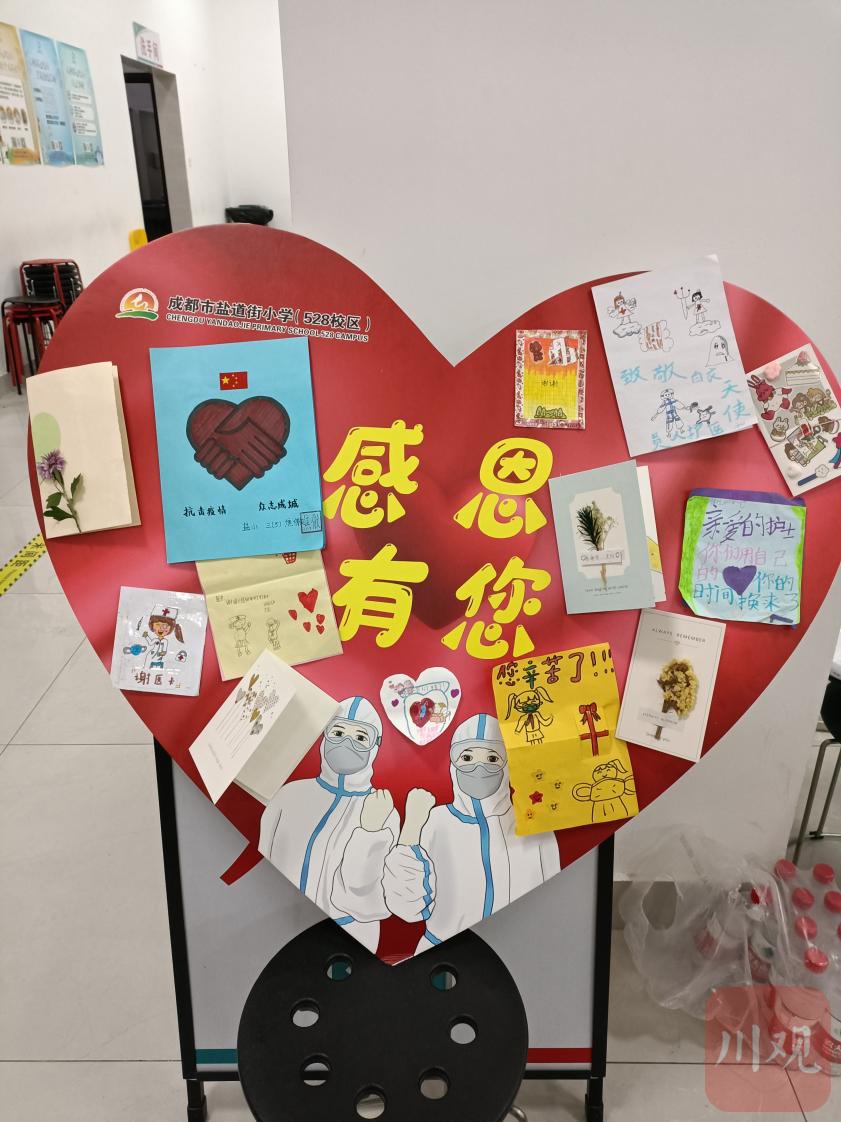 “谢谢你给我们打针”“抗击疫情 众志成城”“您辛苦了”“致敬白衣天使”……11月27日,成都锦江区三圣街道新冠肺炎疫苗临时接种点收获一份意外之喜:成都市盐道街小学528校区三年级五班小朋友自制一份特殊礼物——爱心感恩卡,在一份大大的“爱心墙”上写下心中所想,并送到接种点的工作人员手上。小朋友们写下心中所想,向现场工作人员表达感恩之心。