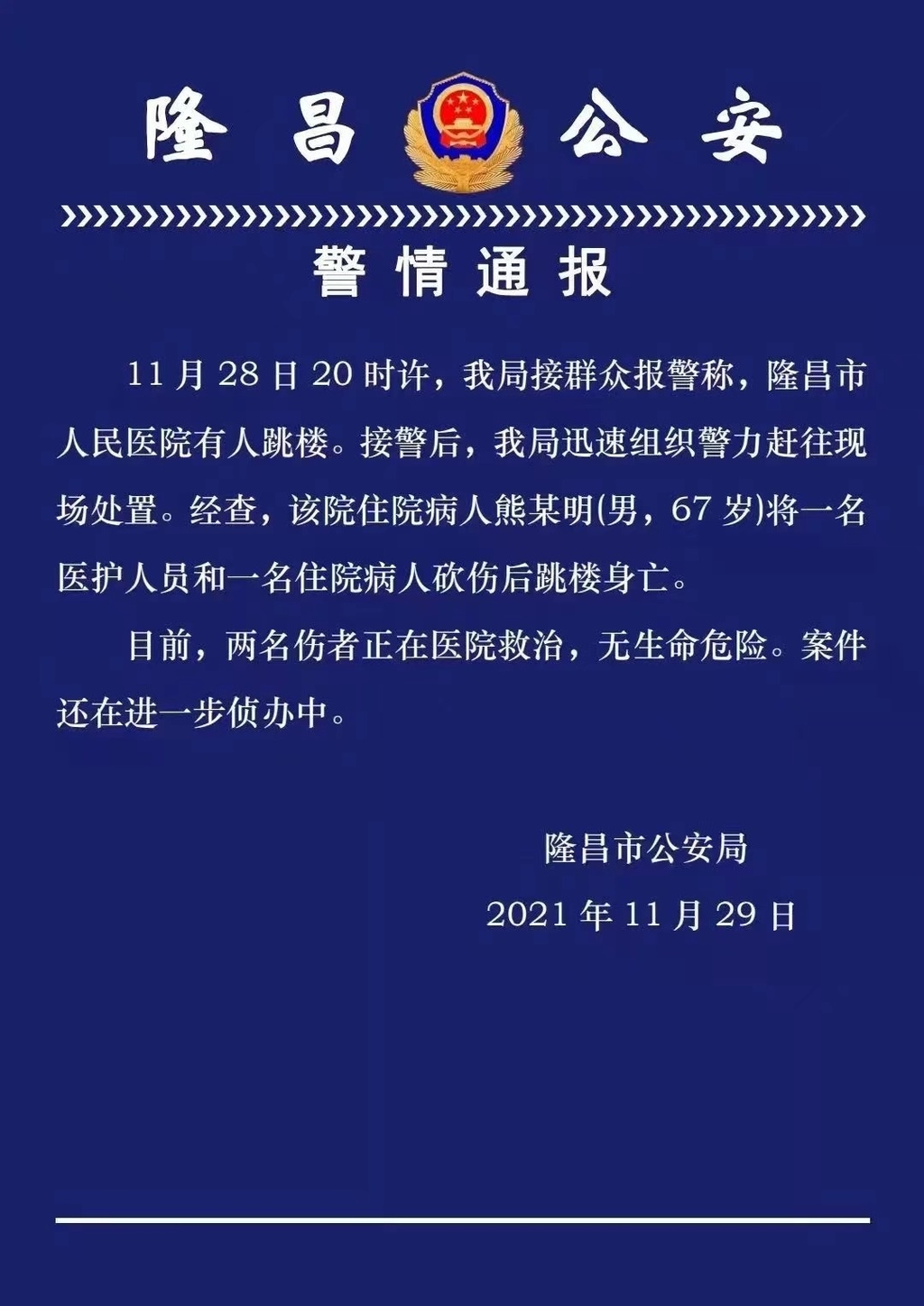 11月29日,内江隆昌市公安局发布警情通报。11月28日20时许,该局接群众报警称,隆昌市人民医院有人跳楼。接警后,该局迅速组织警力赶往现场处置。经查,该院住院病人熊某明(男,67岁)将一名医护人员和一名住院病人砍伤后跳楼身亡。
