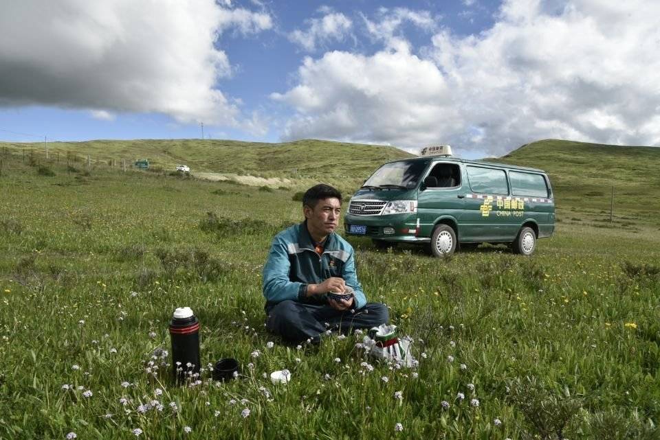 7时45分,迎着毛毛细雨和寒风,哈弄夺机登车出发了。8时40分,车到若尔盖县巴西镇邮政所,交接分拣完邮件,来不及休息,便向下一个投递点班佑村进发。一直忙到11时55分,哈弄夺机到上巴西村投递点交接完邮件,才在街上一家餐馆稍作休息。