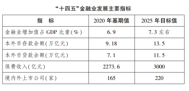 具体来看,到2025年,本外币存款余额将达到13.5万亿元,贷款余额达到11.5万亿元,保费收入达到3000亿元。直接融资占比稳步提高,境内外上市公司达到220家。