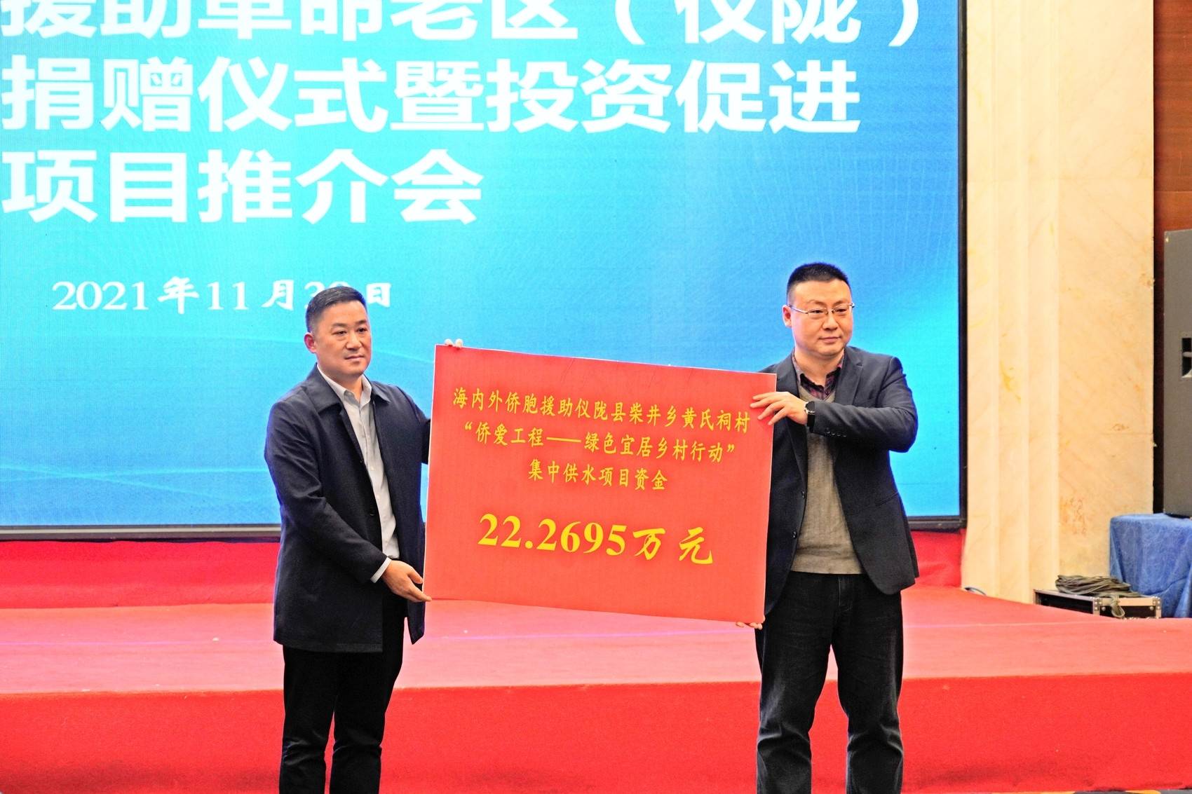 在捐赠仪式上,四川省侨商投资企业协会执行会长、三友集团董事长郝士权代表海内外侨胞向仪陇县捐赠“情系老区 扶智助学”善款63万元。同时,海内外侨胞还向仪陇县柴井乡黄氏祠村捐助了“侨爱工程——绿色宜居乡村行动”集中供水项目资金22.2695万元。在投资项目推介环节,企业代表们纷纷交流发言,大家一致认为,红色仪陇具备优越的资源优势和区位优势,是投资兴业的好地方,下一步将聚焦革命老区,携手助力革命老区发展,为促进地方经济发展贡献侨界力量。