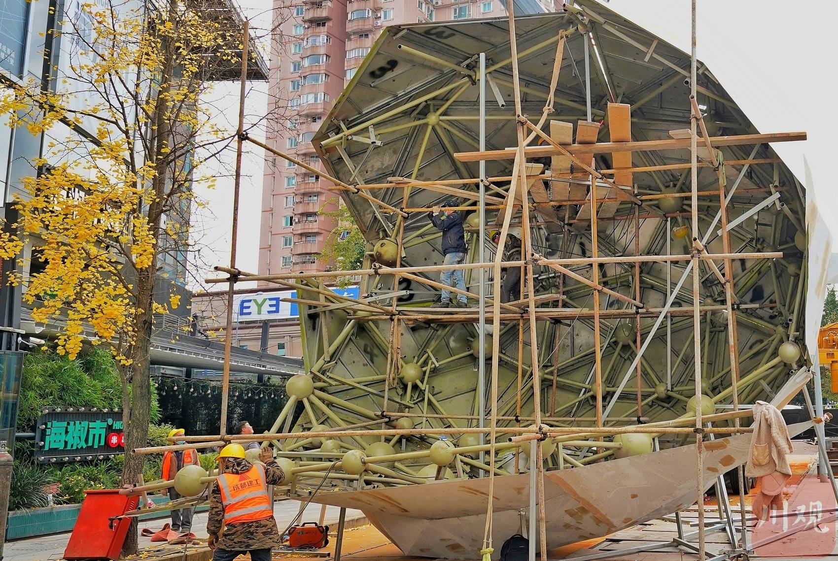 11月22日,准备好吊装的大熊猫头部,支撑造型内部的钢结构很密集。