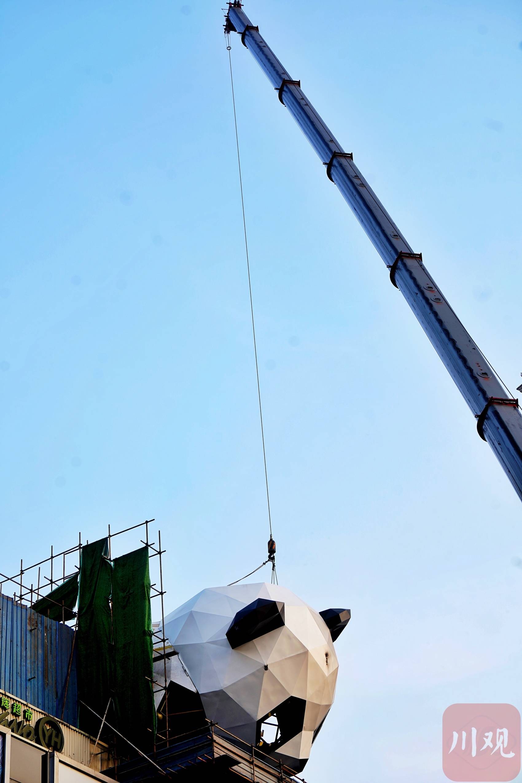 12月1日,蓝天下正在安装的大熊猫艺术装置格外醒目。