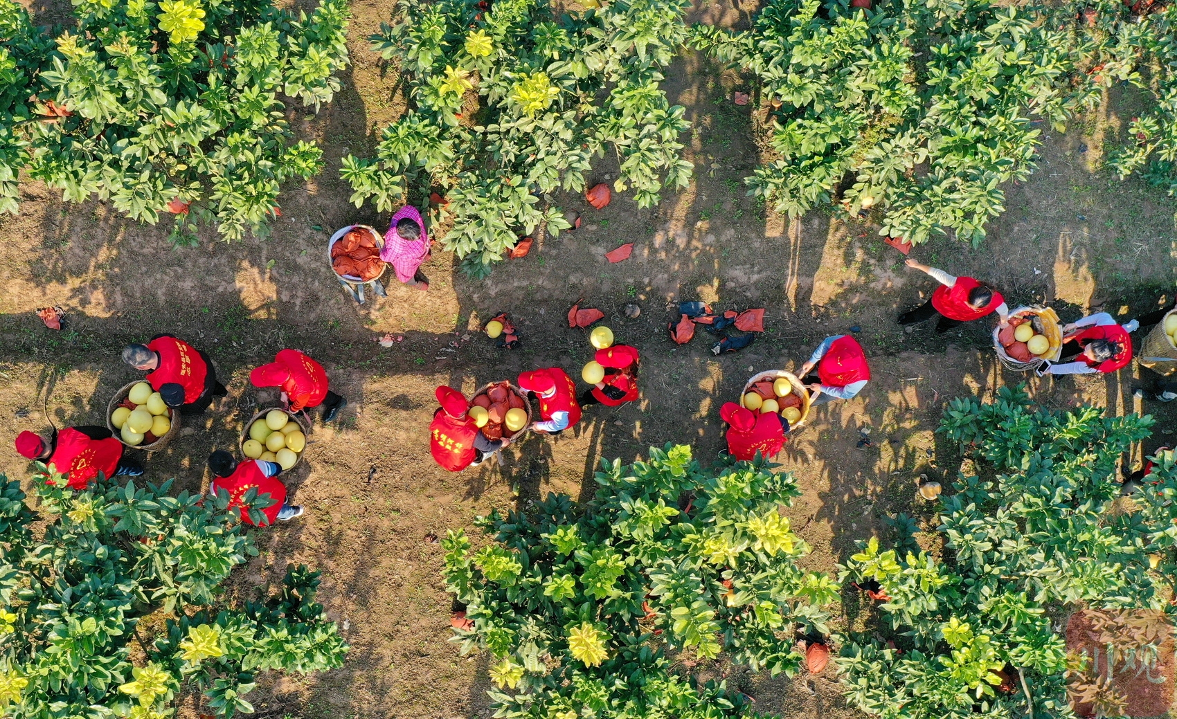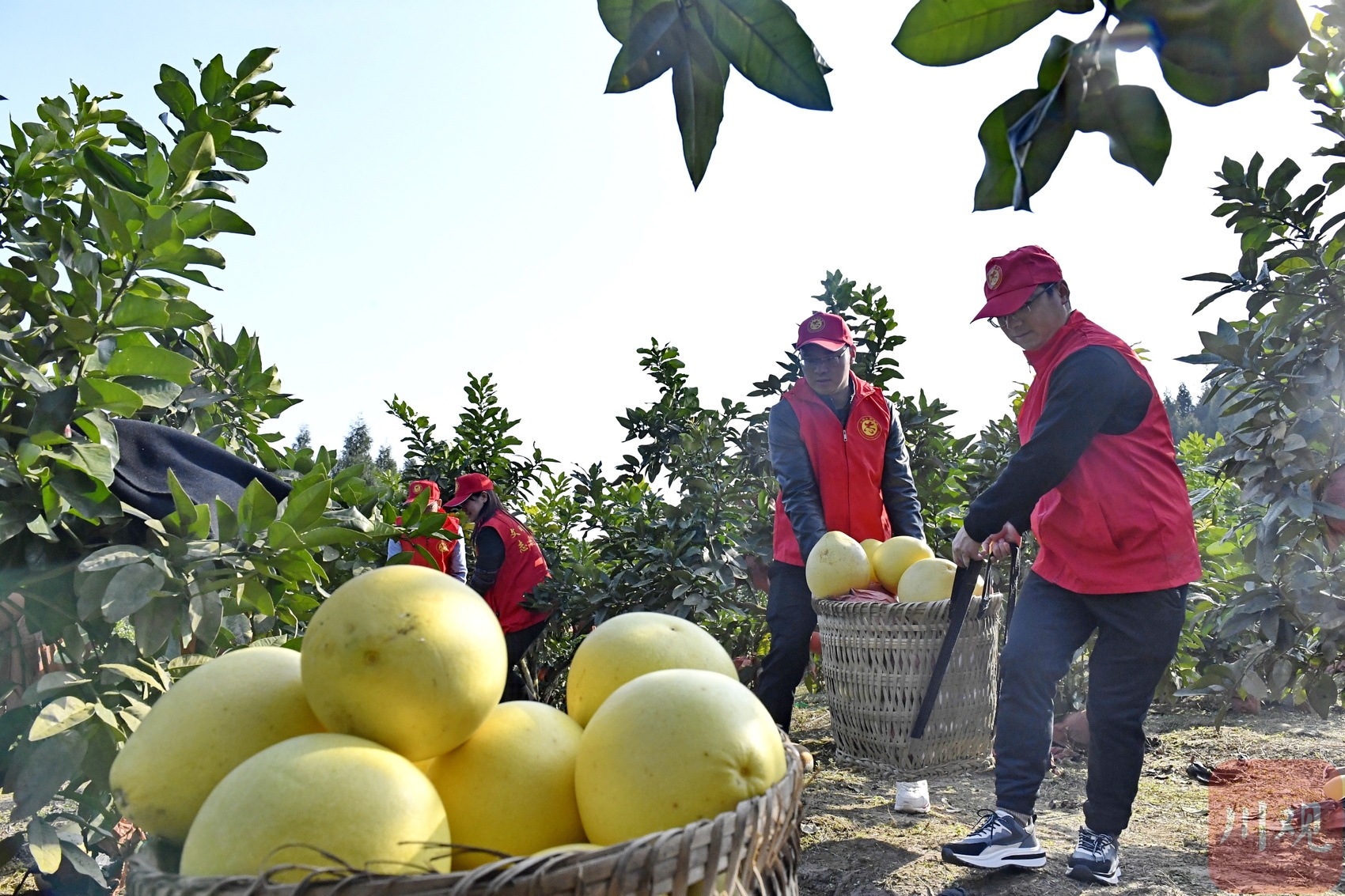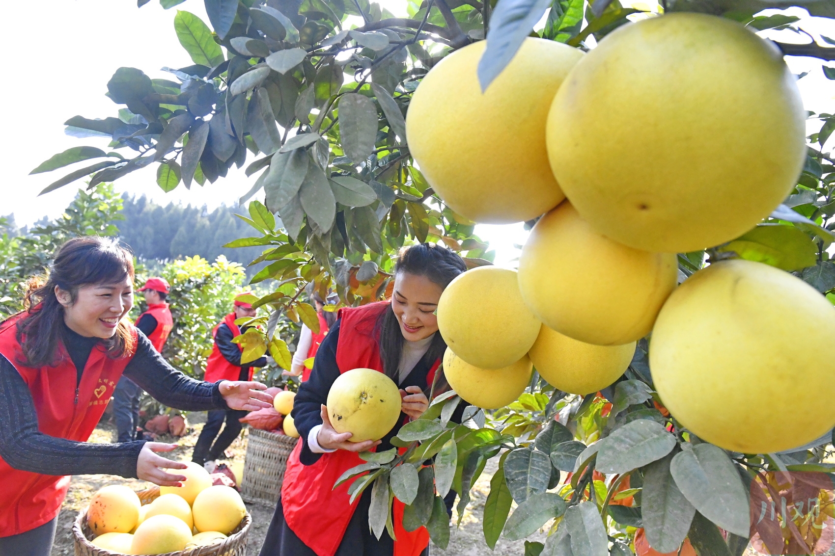 蓬安县锦屏镇石板店社区柚子产业基地沉甸甸的柚子挂满枝头,来自蓬安县纪检监察清风志愿者小分队的志愿者帮助村民采摘柚子。