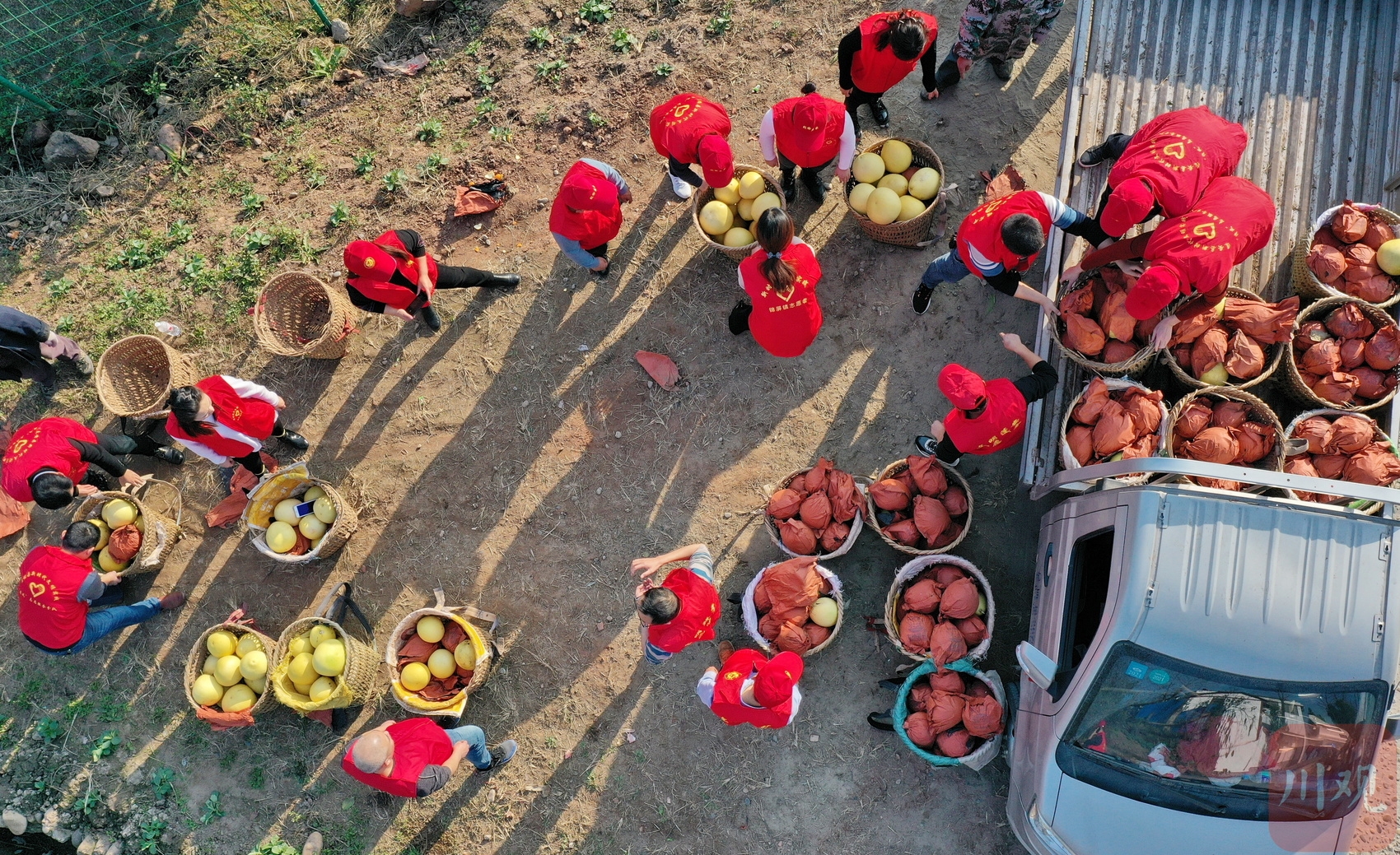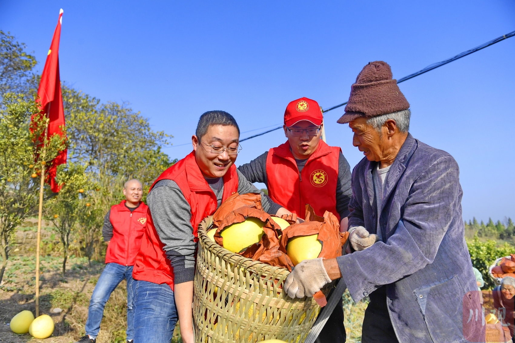 蓬安县锦屏镇石板店社区柚子产业基地沉甸甸的柚子挂满枝头,来自蓬安县纪检监察清风志愿者小分队的志愿者帮助村民把采摘好的柚子装车销售。