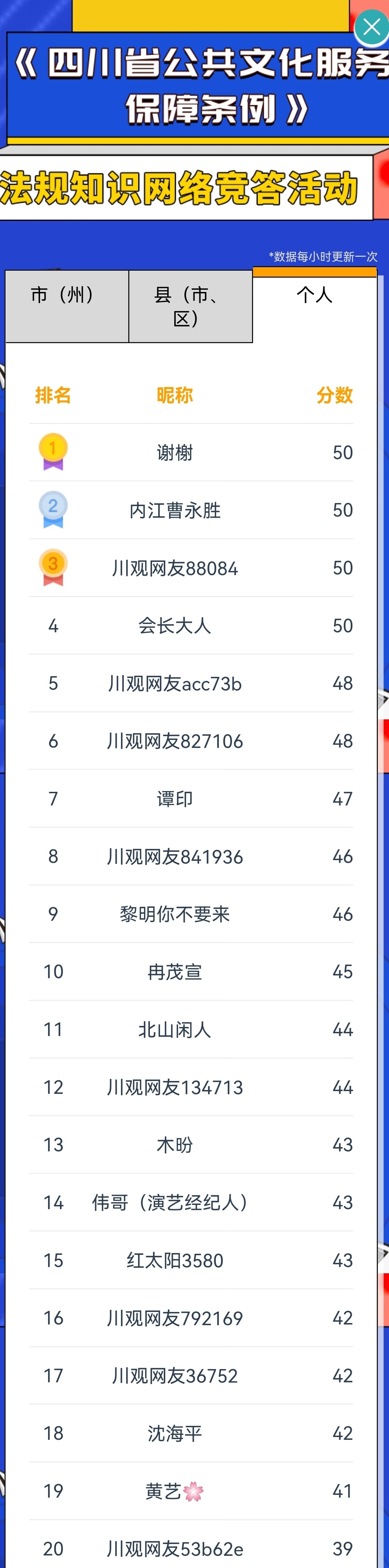 截至12月2日中午12点,知识竞答活动上线24小时以来,已经吸引了全省来自21市州的75个县(市、区)共计6648人次参与答题。其中,绵阳市、攀枝花市、成都市暂列市州排名榜前三。德阳市中江县、广安市广安区、攀枝花市东区暂时位居县(市、区)榜单前三名。