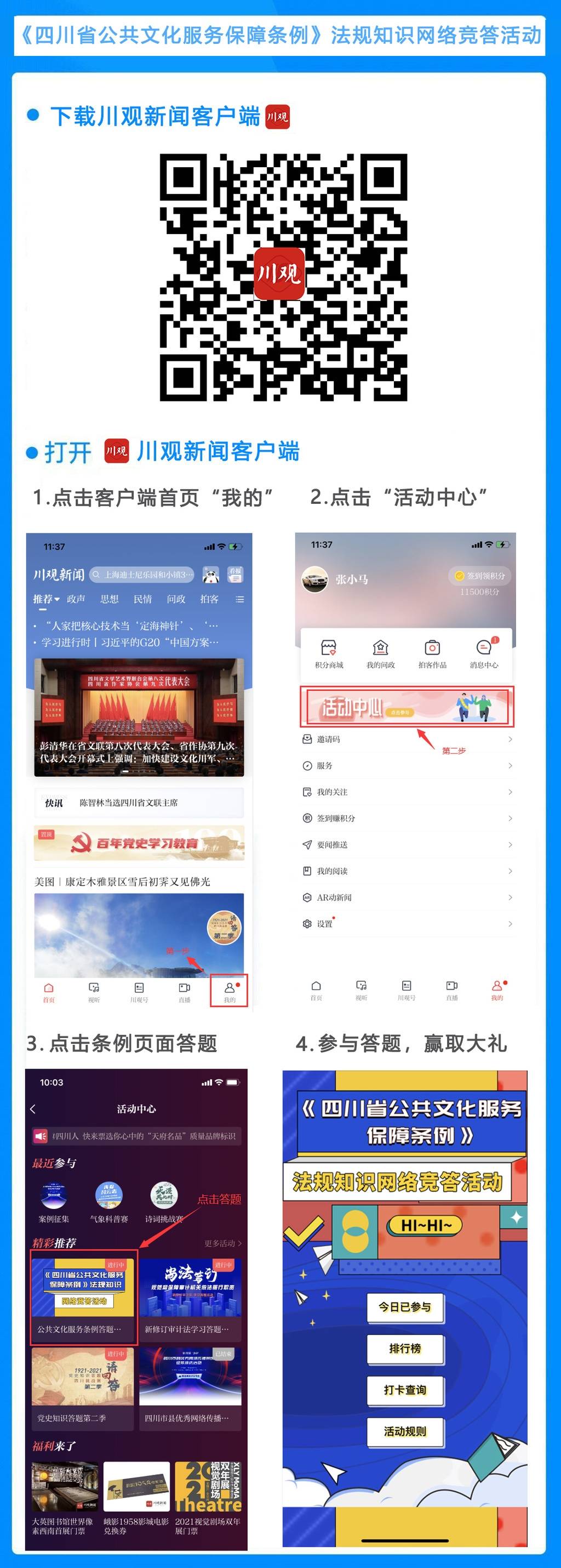 12月1日,《四川省公共文化服务保障条例》正式施行。为宣传、贯彻落实《四川省公共文化服务保障条例》,由省委宣传部、省文化和旅游厅、省体育局、省广播电视局、省文物局联合推出的《四川省公共文化服务保障条例》知识竞答活动也于1日上午12点同步上线!
