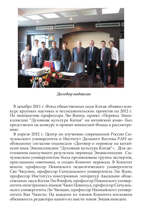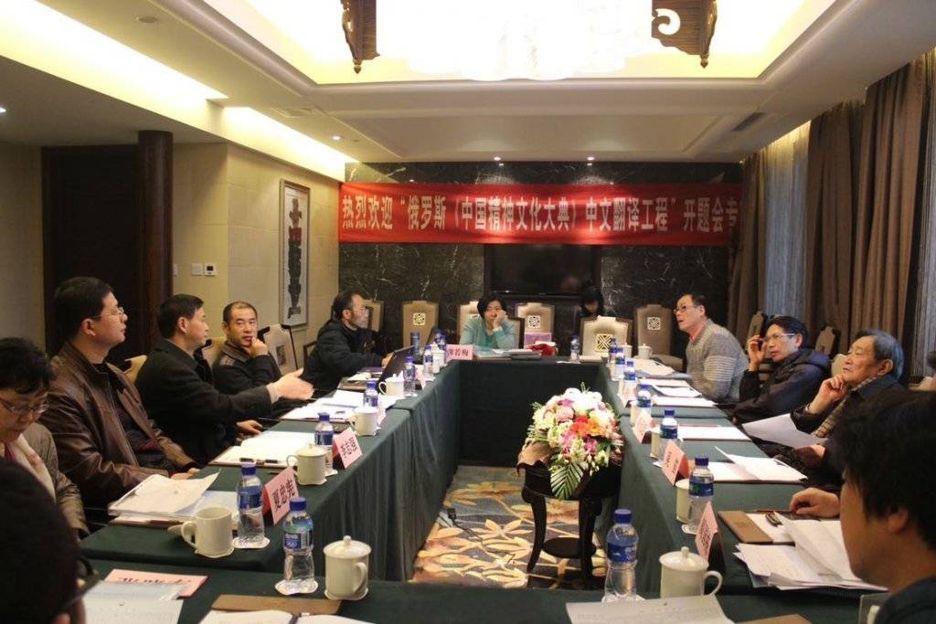 2010年,四川大学当代俄罗斯研究中心正式成立。同年9月,《中国精神文化大典》副主编卢基扬诺夫一行8人应邀前来参加成立仪式,《中国精神文化大典》正是他们送给当代俄罗斯研究中心的礼物。“当时我们就跟卢基扬诺夫说,我们一定要把这套书翻译成中文。”刘亚丁说。