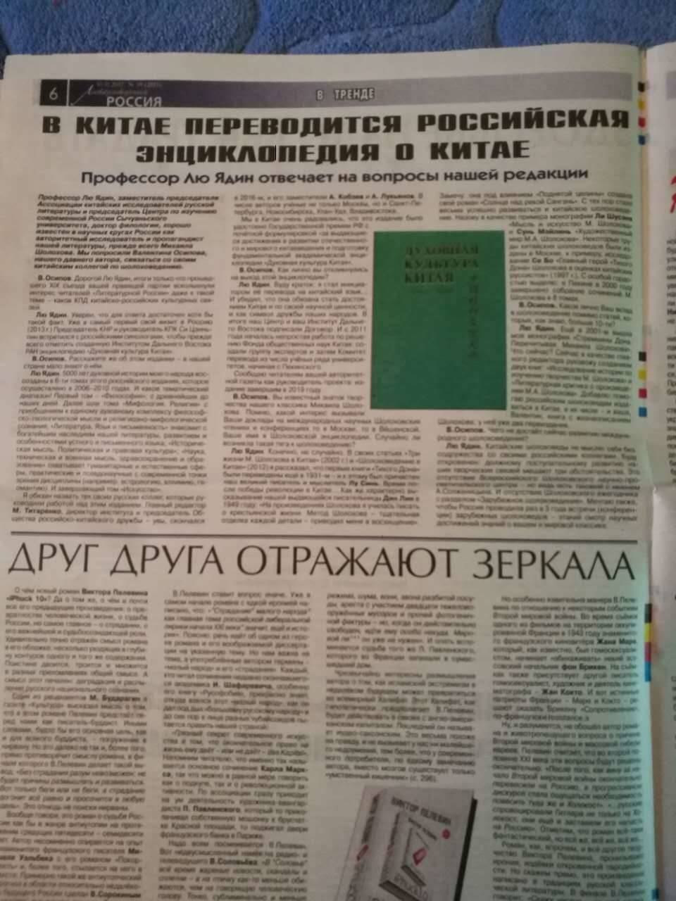 《文学俄罗斯》报就《中国精神文化大典》翻译专访刘亚丁教授。