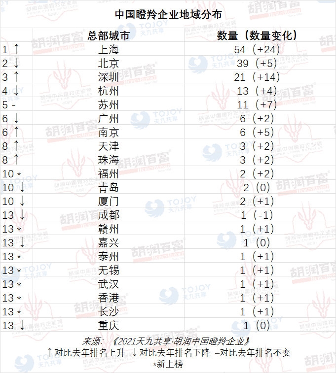 上海超越北京,再次成为瞪羚企业最多的城市,比去年增加24家,达到54家;