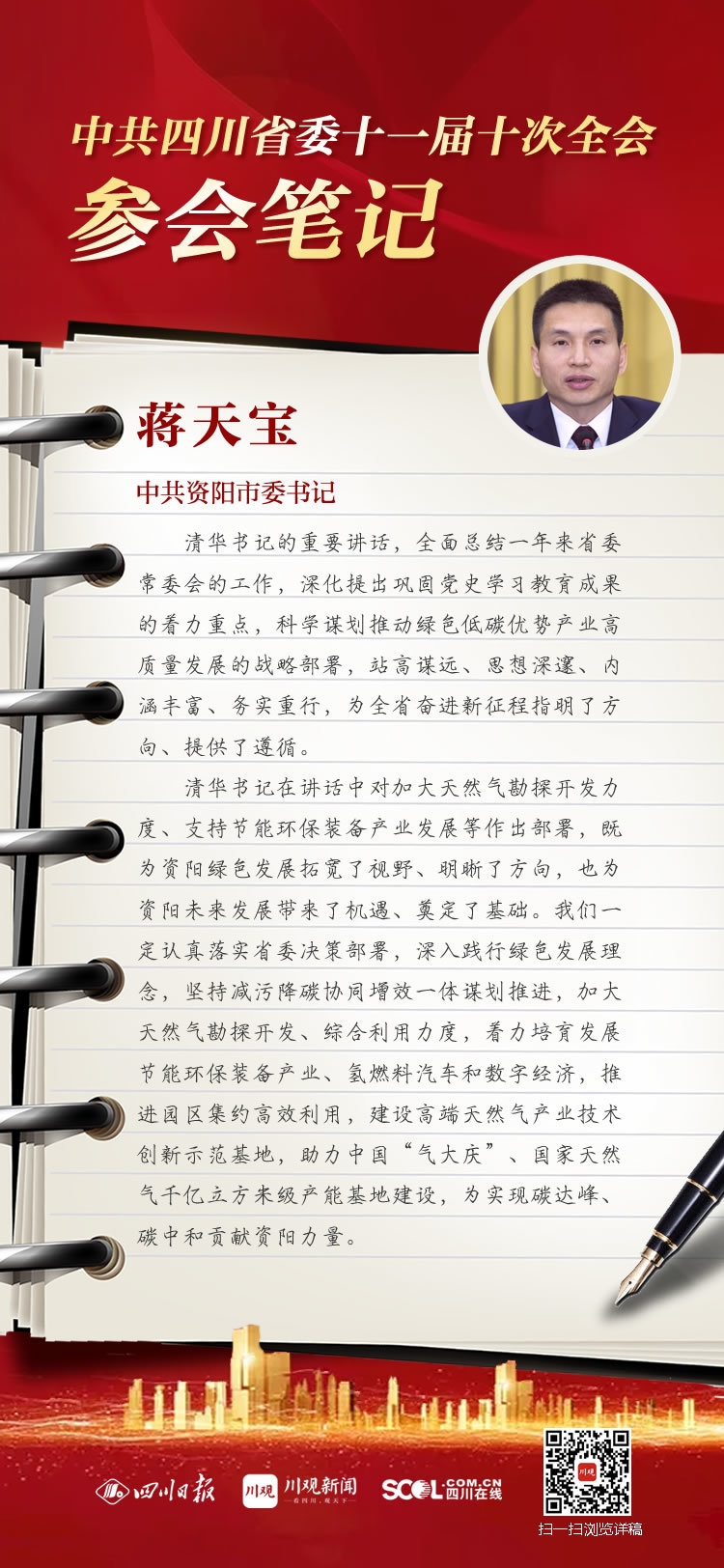 清华书记在讲话中对加大天然气勘探开发力度、支持节能环保装备产业发展等作出部署,既为资阳绿色发展拓宽了视野、明晰了方向,也为资阳未来发展带来了机遇、奠定了基础。我们一定认真落实省委决策部署,深入践行绿色发展理念,坚持减污降碳协同增效一体谋划推进,加大天然气勘探开发、综合利用力度,着力培育发展节能环保装备产业、氢燃料汽车和数字经济,推进园区集约高效利用,建设高端天然气产业技术创新示范基地,助力中国“气大庆”、国家天然气千亿立方米级产能基地建设,为实现碳达峰、碳中和贡献资阳力量。