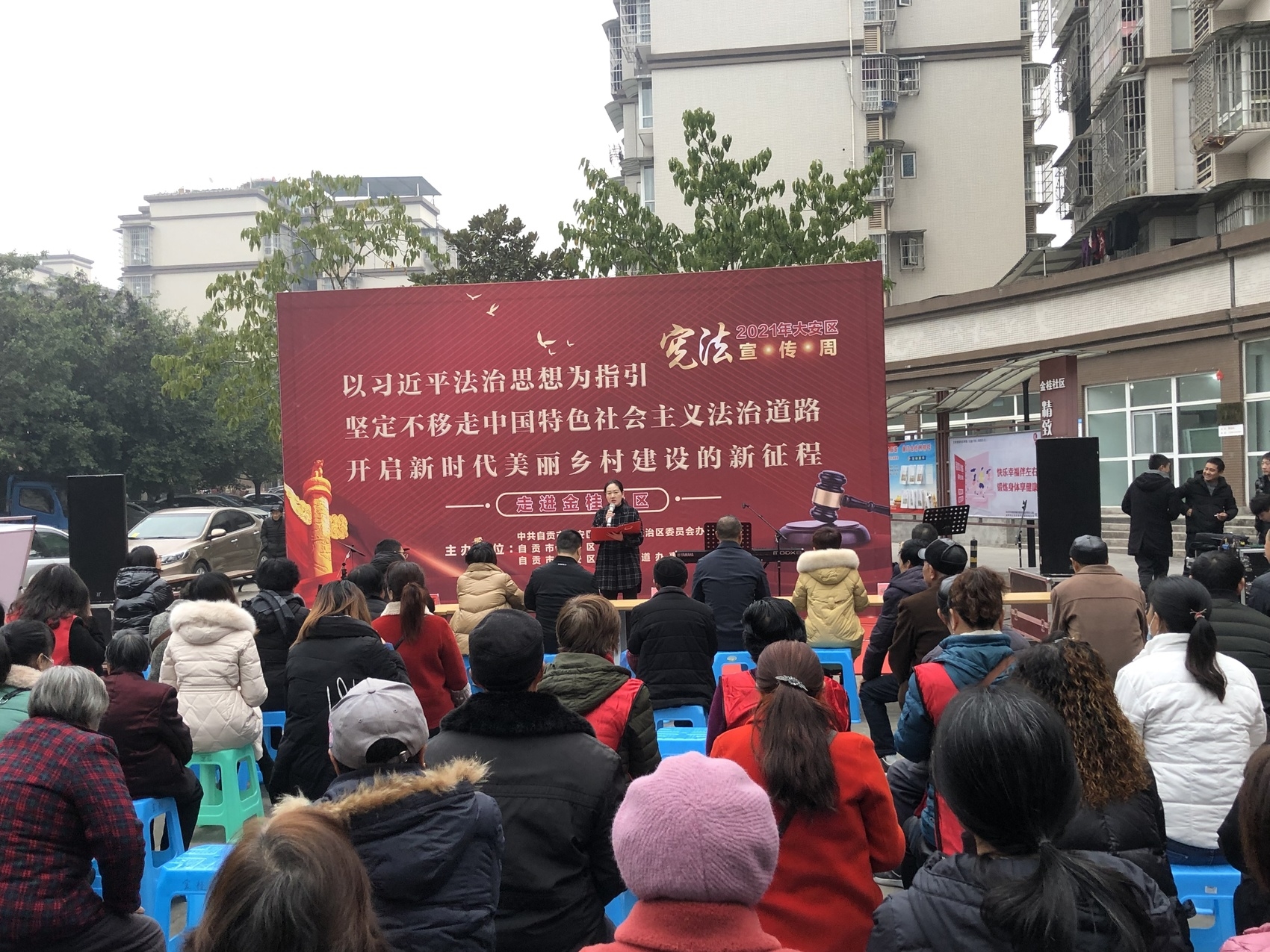 12月4日是第八个国家宪法日,也是第四个“宪法宣传周”。当天,自贡大安区和平街道金桂社区热闹非凡,该区区委依法治区办、区司法局、和平街道办事处在此开展“宪法宣传周”活动,以有奖竞答的方式向社区居民普及《宪法》《民法典》《安全生产法》等法律知识,居民们踊跃竞答,让宪法宣传更加深入人心,现场还为居民们带来《映山红》《星光》《我和我的祖国》等文艺节目。