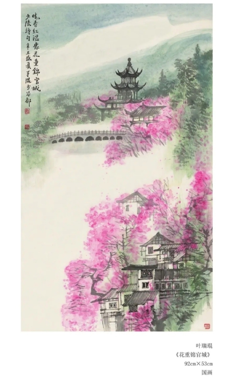 展览中,不少来自名家的精品佳作让人一饱眼福。叶瑞琨的《花重锦官城》里,将姹紫嫣红的蓉城美景搬上画卷,其整体的笔墨呈现出清远之势,富有不俗的艺术美感。邝明惠的水印版画《花旦之一》同样吸睛。素雅的颜色里,一名花旦身姿优雅。此次创作延续邝明惠作品简约和喜留白的特点。画家省略花旦的五官表情,让观者仅凭画中人物的服饰和动作,来揣摩人物的表情。“四川是黑白木刻版画的集大成者,水印版画其实也是四川版画的重要一块。”邝明惠介绍,做水印版画需要掌握好4个点,即木板水分、纸上水分和笔上水分,同时,还需根据经验判断画面干湿不同情况下的最终画面呈现。由于水印版画需要把颜色水分全部挤掉,使得颜色逐渐饱满,这就意味着绘制色彩时,一个颜色就需要叠印五到六次,才能最终成色,他指着花旦衣袖上的红花色彩回忆,仅这个红色,就叠印了5次才最终呈现。