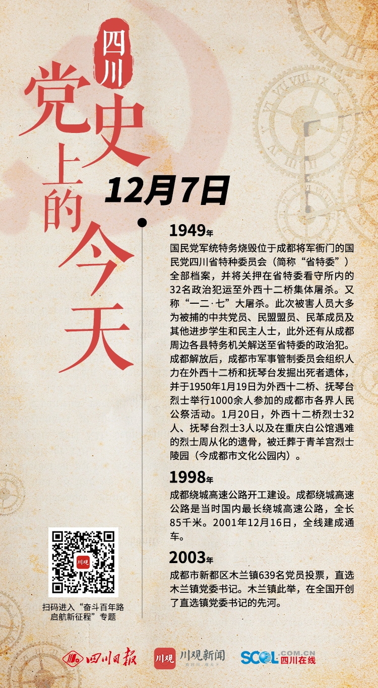 1949年 国民党军统特务烧毁位于成都将军衙门的国民党四川省特种委员会(简称“省特委”)全部档案,并将关押在省特委看守所内的32名政治犯运至外西十二桥集体屠杀。又称“一二·七”大屠杀。此次被害人员大多为被捕的中共党员、民盟盟员、民革成员及其他进步学生和民主人士,此外还有从成都周边各县特务机关解送至省特委的政治犯。成都解放后,成都市军事管制委员会组织人力在外西十二桥和抚琴台发掘出死者遗体,并于1950年1月19日为外西十二桥、抚琴台烈士举行1000余人参加的成都市各界人民公祭活动。1月20日,外西十二桥烈士32人、抚琴台烈士3人以及在重庆白公馆遇难的烈士周从化的遗骨,被迁葬于青羊宫烈士陵园(今成都市文化公园内)。