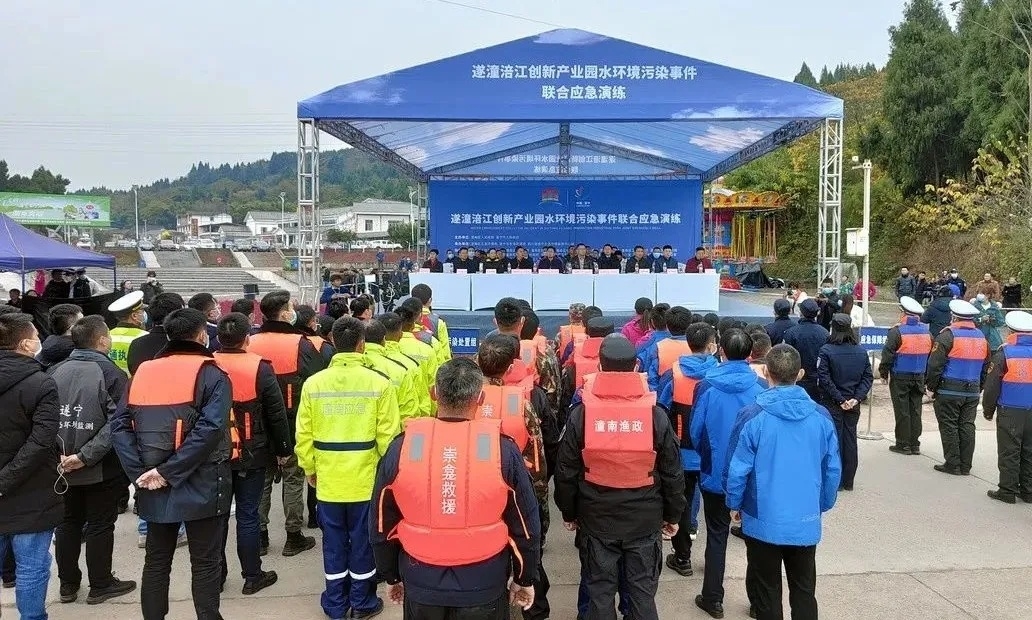 12月8日,由遂宁市人民政府、重庆市潼南区人民政府联合主办,遂宁市生态环境局、重庆市潼南区生态环境局、四川省遂宁生态环境监测中心站承办的遂潼涪江创新产业园水环境污染事件联合应急演练在潼南区崇龛镇举行。本次演练模拟中国石油天然气股份有限公司西南油气田分公司川中油气矿输油管道破损,大量凝析油泄漏,部分流入琼江,危及下游饮用水水源地水质安全。
