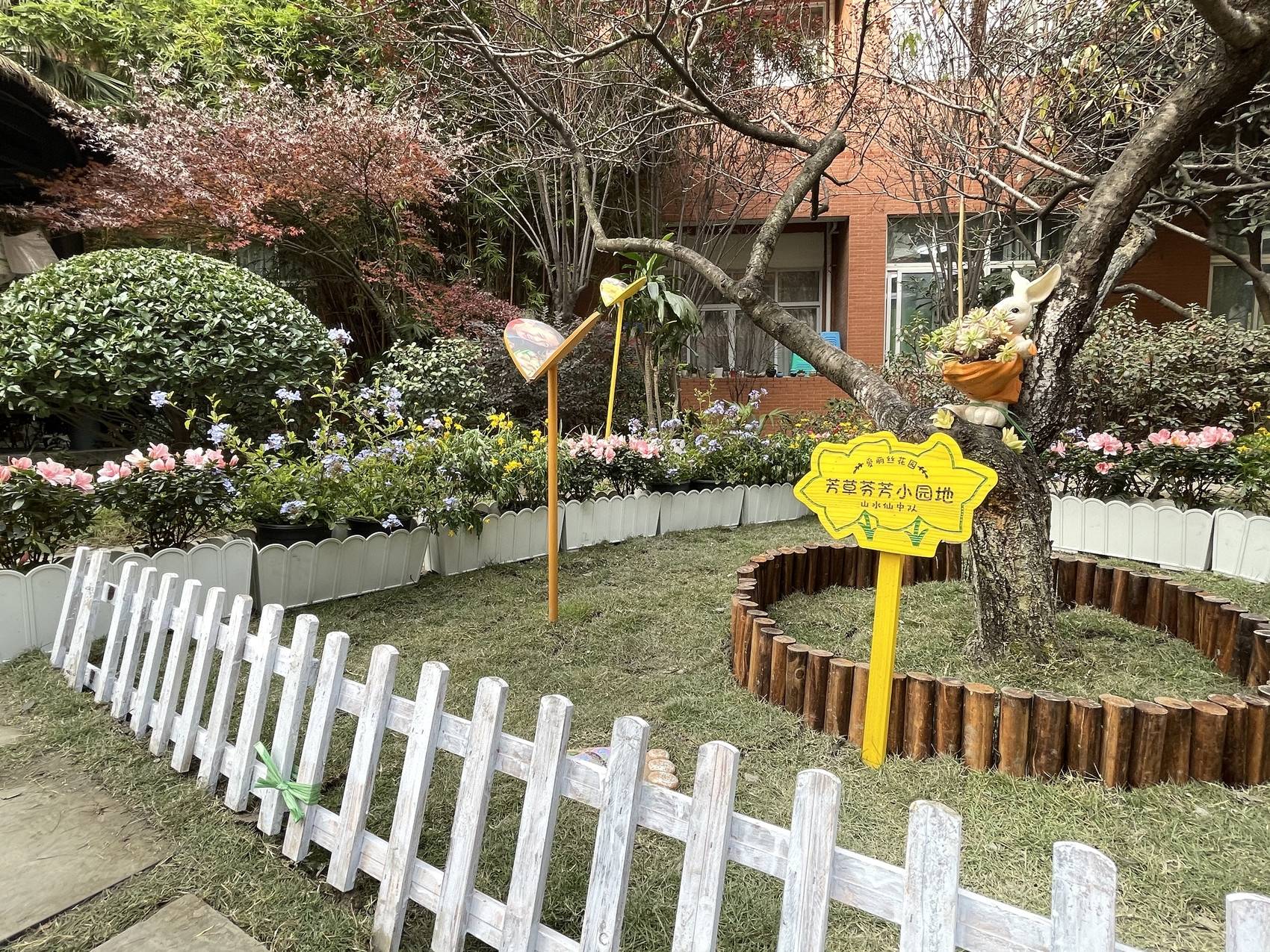 旁边一块弧形的小园地,属于五年级七班“太阳花中队”,主题围绕动物。