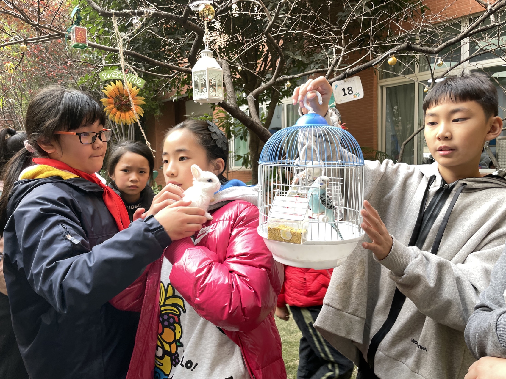 每到下课,这里就特别热闹:树枝上,两只鹦鹉声音悦耳;草坪上,兔子仓鼠活蹦乱跳;花盆里,几颗草莓长势喜人…吸引不少其他年级的老师和同学过来“串门”。