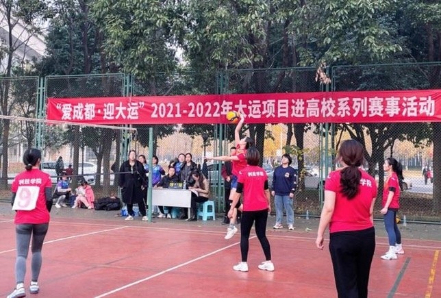 “爱成都·迎大运”2021—2022年大运项目进高校系列赛事活动旨在助力成都加快世界赛事名城建设,强化对大运精神、大运知识的传递,提升大学生参与支持大运、参与大运、奉献大运的意识和能力,营造“爱成都·迎大运”的浓厚氛围,让高校校园到处是运动的身影,充满青春的活力。11月28日,四川师范大学在成龙校区举行羽毛球比赛,该校共有22个学院300余名大学生羽毛球爱好者参与其中。经过激烈鏖战,体育学院、美术学院·书法学院、教育科学学院、商学院代表队分获本次羽毛球团体赛一至四名。在西南交通大学,师生排球比赛同样进行得如火如荼。比赛以学院为单位,设男子组和女子组,比赛首次采用师生共同组队的方式进行比赛,共有来自22个学院、24支队伍、300余名师生报名参赛。比赛开始之前,学校还专门针对校内比赛的裁判员进行了2次排球裁判培训,培训内容为国际排联记录表填写,共有270名师生参与学习。电子科大组织举办了全校首届班级篮球联赛,共计46支班级篮球队、近500人参与,分为四个阶段比赛,预计比赛28天。同时,改校还开展校内大学生大运项目普及培训讲座,针对世界大运会历史及田径项目进行介绍,参与讲座培训人数300余人。成都大学12月4日举办了两场球类赛事,比赛共有23个学院、238名学生参赛。