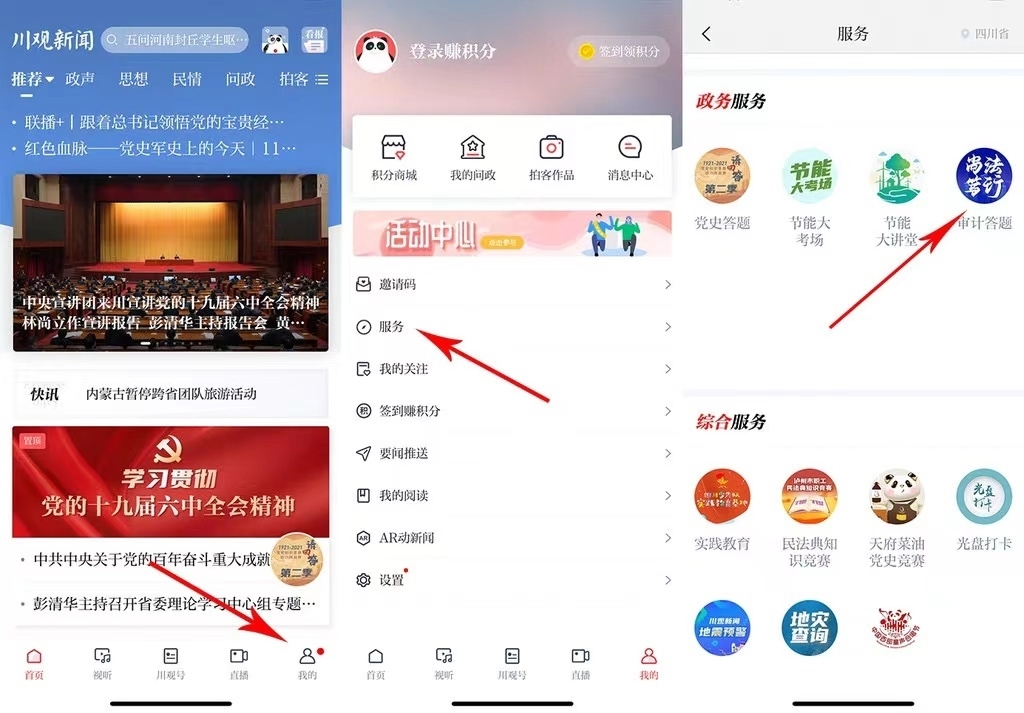 (四)在APP推荐页,点击“我的”进入“服务”功能页,找到“审计答题”页面。