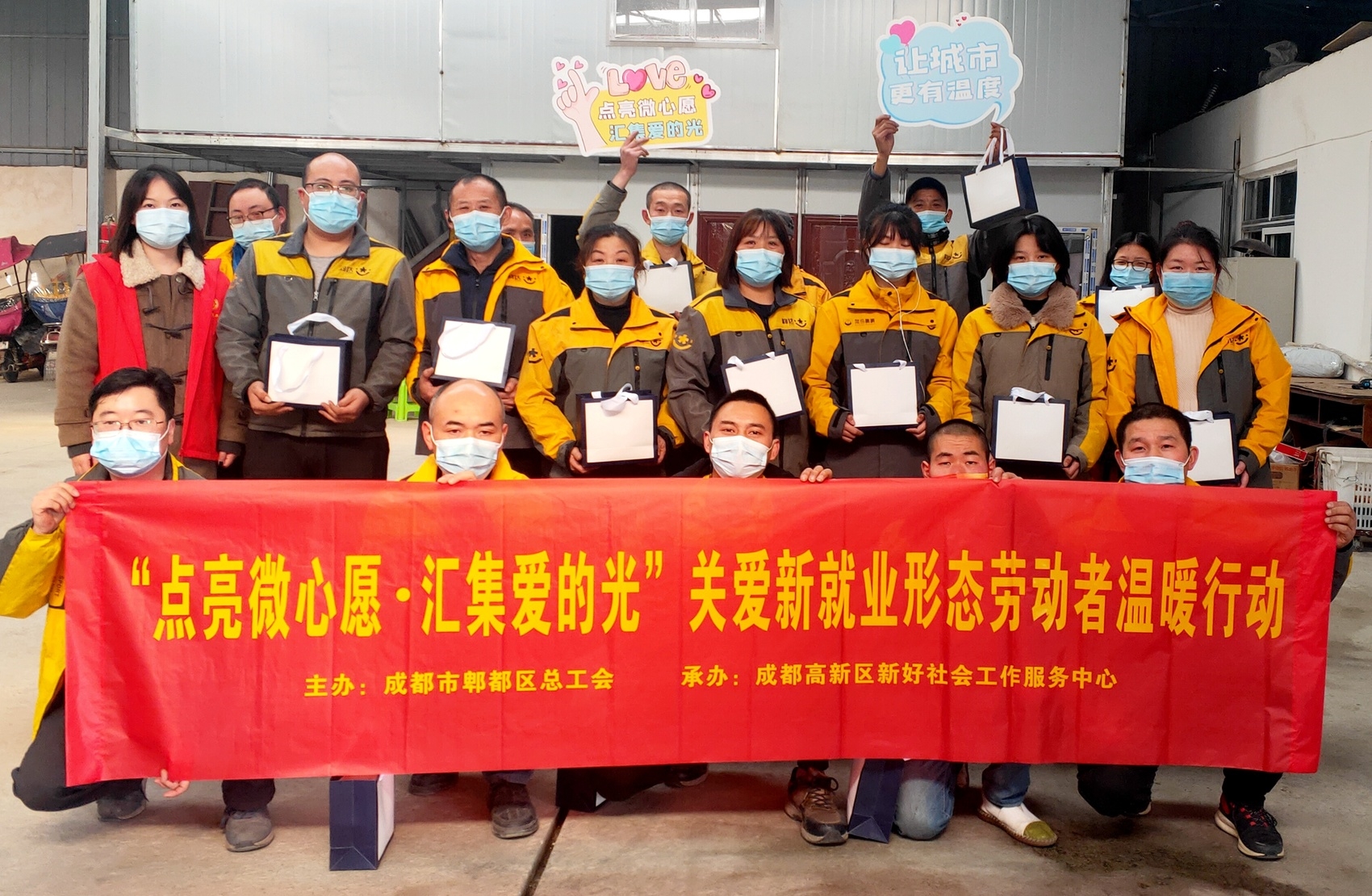 为充分发挥了工会组织示范带头作用,推进新就业形态劳动者服务工作,在郫都区营造理解、尊重、关爱职工群体的良好氛围,郫都区总工会针对郫都区辖区内外卖和快递行业,开展了“点亮微心愿·汇集爱的光”关爱新就业形态劳动者活动。活动现场为外卖员、快递员送去了保温杯、雨伞、暖宝宝、口罩等冬日温暖包,并详细了解他们的工作、生活情况和实际困难,嘱咐大家一定要注意安全,注意保暖。接过爱心礼包的快递小哥王强兵说 ,工会组织如此给力,自己工作的干劲和热情更足了,之后将以更加饱满的精神状态、更为积极的工作姿态、更加奋勇争先的心态投入到工作中去。