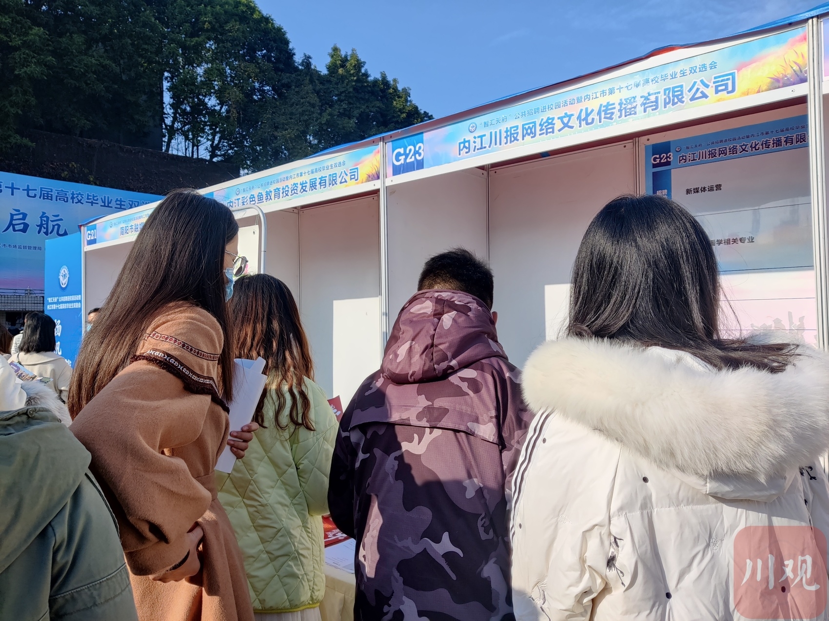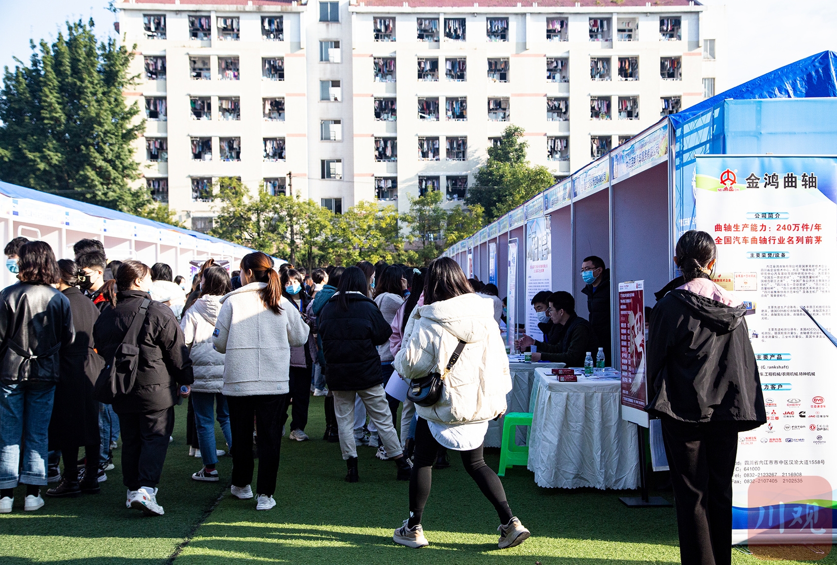 球场上,醒目的巨幅展板列出了参加双选会的企业和机构名录,吸引学生的目光。约440家单位参加,主要来自内江、成渝和东南沿海等地,双选会提供岗位数合计超过16000个。