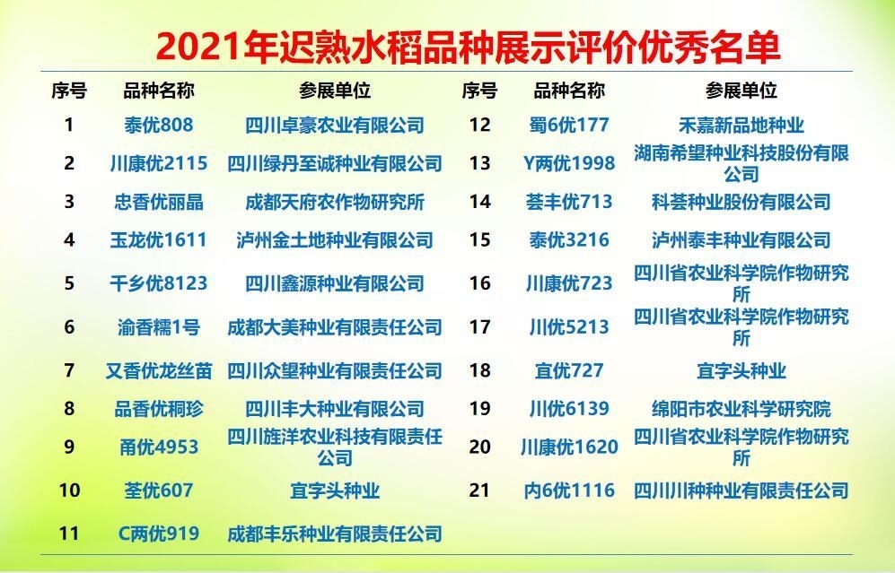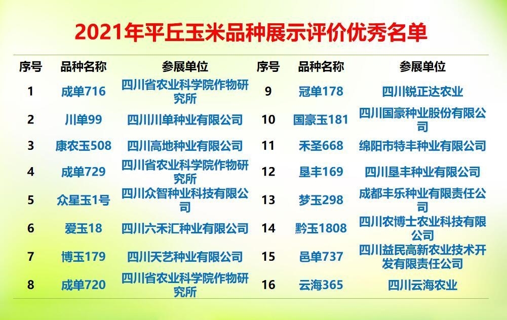 经过激烈角逐,最终“川单99”“成单716”等23个玉米品种,“泰优808”“川康优2115”等25个水稻品种脱颖而出。