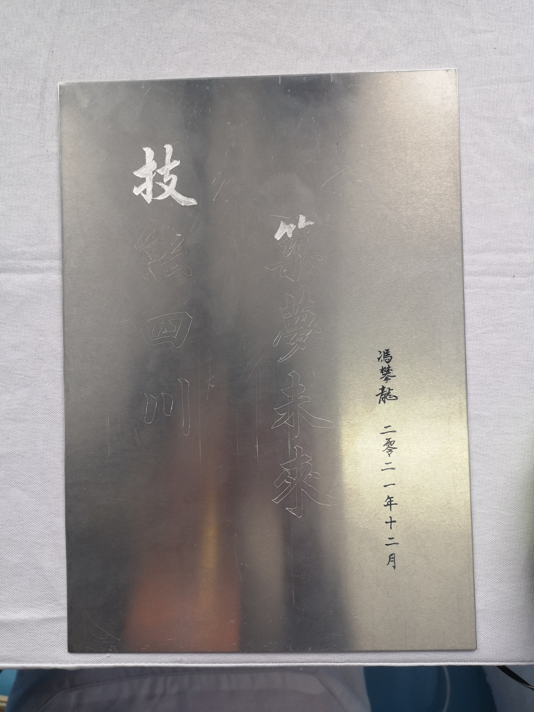 用记号笔在金属板材上临摹,随后用刀片勾勒文字边框,电动铣刀沙沙启动,将金属表面铣切下薄薄一层……随着四川省劳动模范、四川省五一劳动奖章获得者冯攀龙耐心而精细的操作,“技能四川 筑梦未来”八个大字在金属板上逐渐清晰起来。