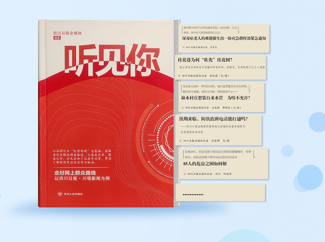 “缺水村庄想装自来水,为啥不允许”;“桂花巷为何‘砍秃’桂花树”;“走向数字时代,如何‘带上’白发苍苍的他们”;“百年古民居,为何一朝成废墟”……在《听见你》一书中,四川日报全媒体从过往报道中,精选出35组深度调查报道,汇集成册,读者不仅能从书中品读到一个个精彩的新闻故事,更能感受到我省各级党政职能部门积极倾听民声、正视问题、完善治理、增进理解的行动,感受到主流媒体传民声、达民情、解民忧,积极做好党委政府与群众粘合剂的努力。
