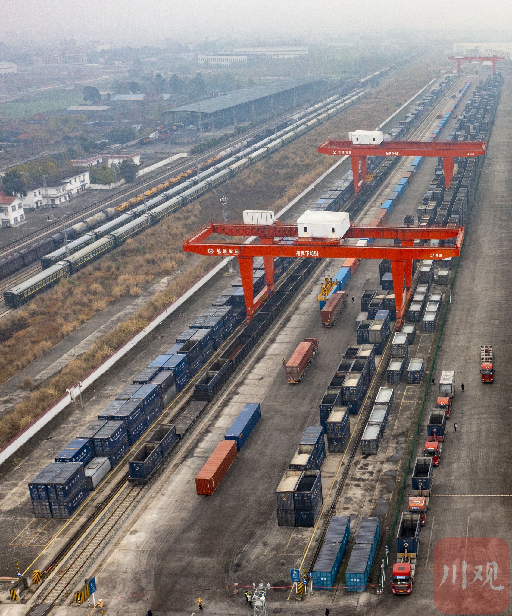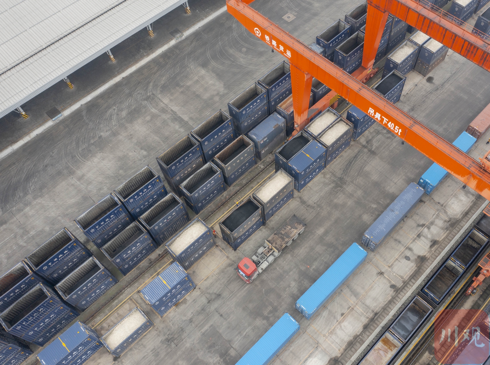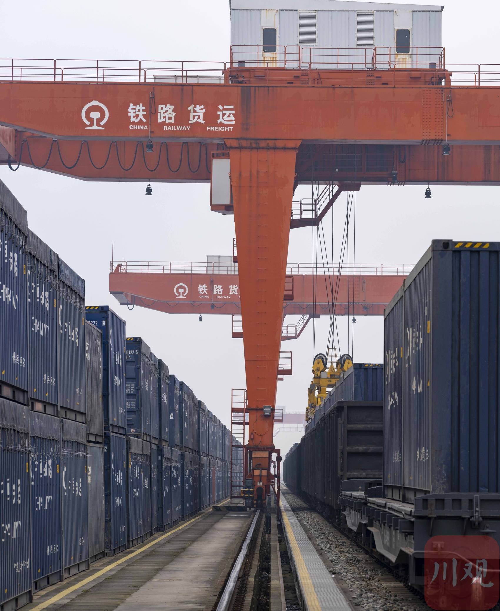 12月12日,德阳国际铁路物流港黄许镇站,以化肥、钢铁、粮食等出口货物为主的各类集装箱一字排开,门吊起重繁忙,工人们正有序操作装卸设备搬运货物。