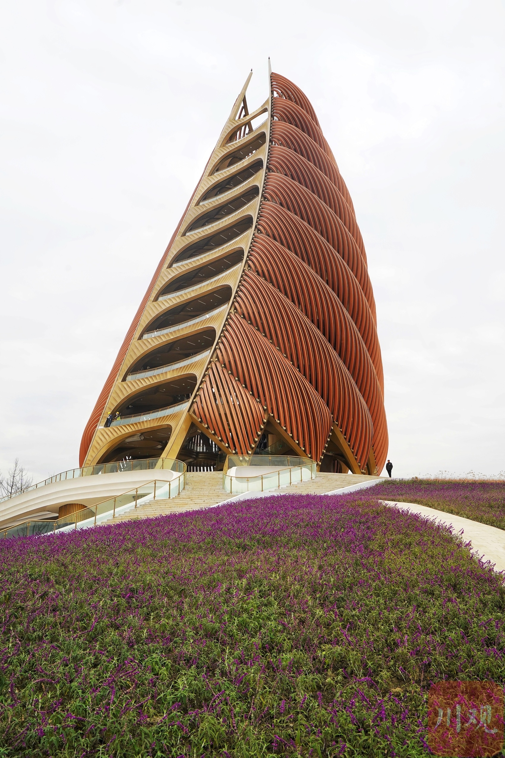 扩建区标志建筑瞭望塔造型如春笋一般。全塔高69.8米,共9层,分别呈现活力舞台、熊猫剧场、艺术展廊、创意书屋、竹叶茶室、奇遇时空、观景平台等多重空间。塔身通体钢构配以玻璃幕墙,塔形如雨后春笋,楼层空间采用芙蓉花为指引,游客游览至此仿佛置身于繁花盛景之中。