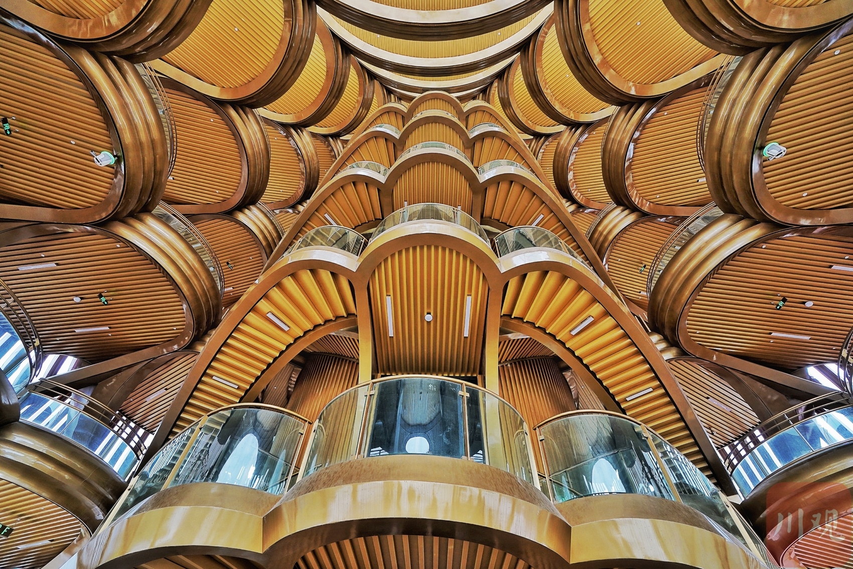 走进扩建区,就能来到观景平台,往下俯瞰,便能看到圆形的熊猫馆舍遍布在树林之间;往右看,如春笋般的瞭望塔映入眼帘。往左看,山区上有一片彩林,彩林之中便是幼崽熊猫的居住地。