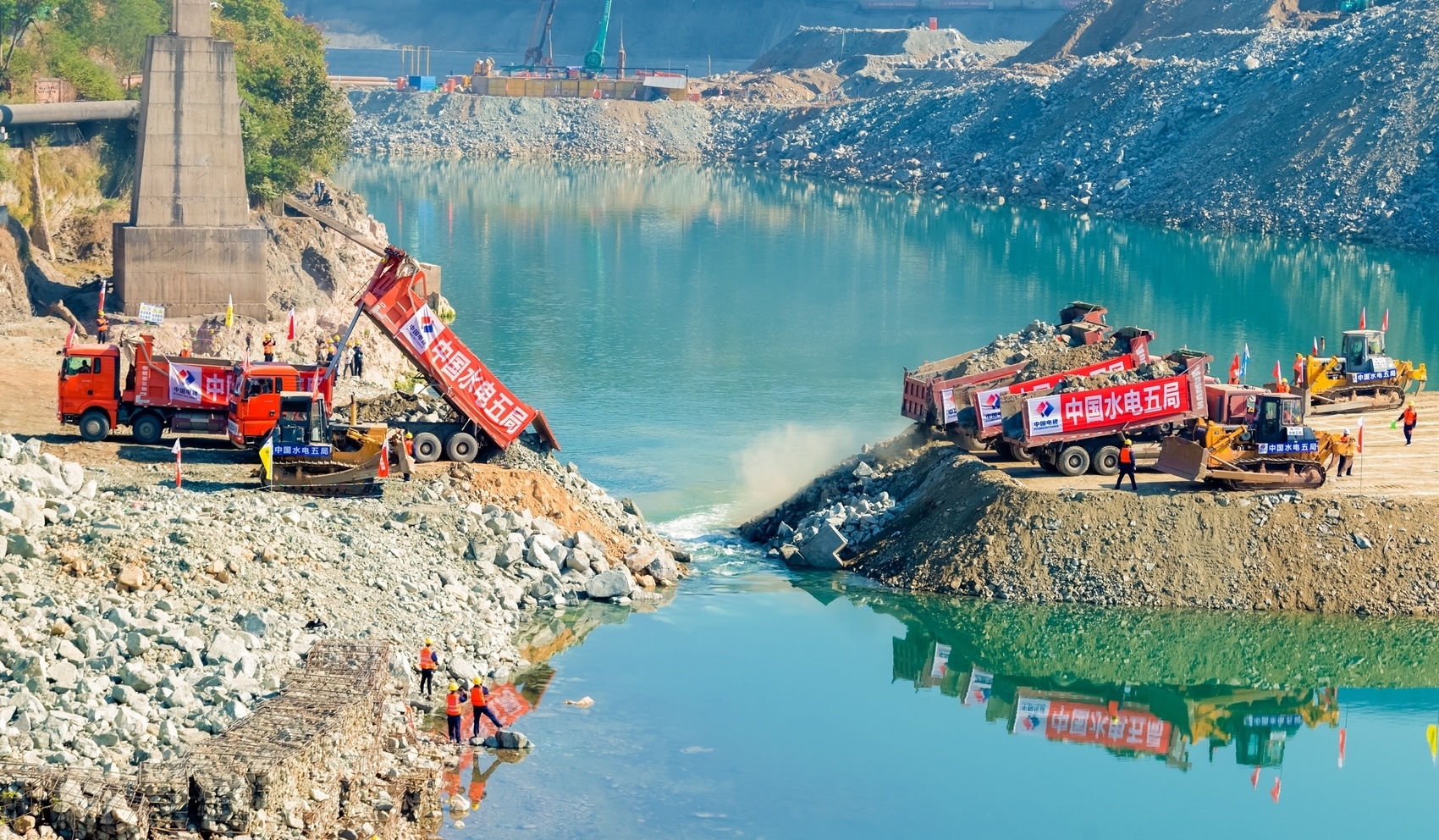 12月16日11时50分,位于四川省攀枝花市金沙江干流上的银江水电站施工现场,随着一声合龙令下达,数十辆装满石料的大型工程车辆卷起数米长的烟尘,直逼江水奔腾的龙头,紧张有序、轮番交替地向龙口倾投石料。10分钟左右,金沙江主干河床最后的过流通道被缓缓关闭,现场顿时响起雷鸣般的掌声和机械的轰鸣声。