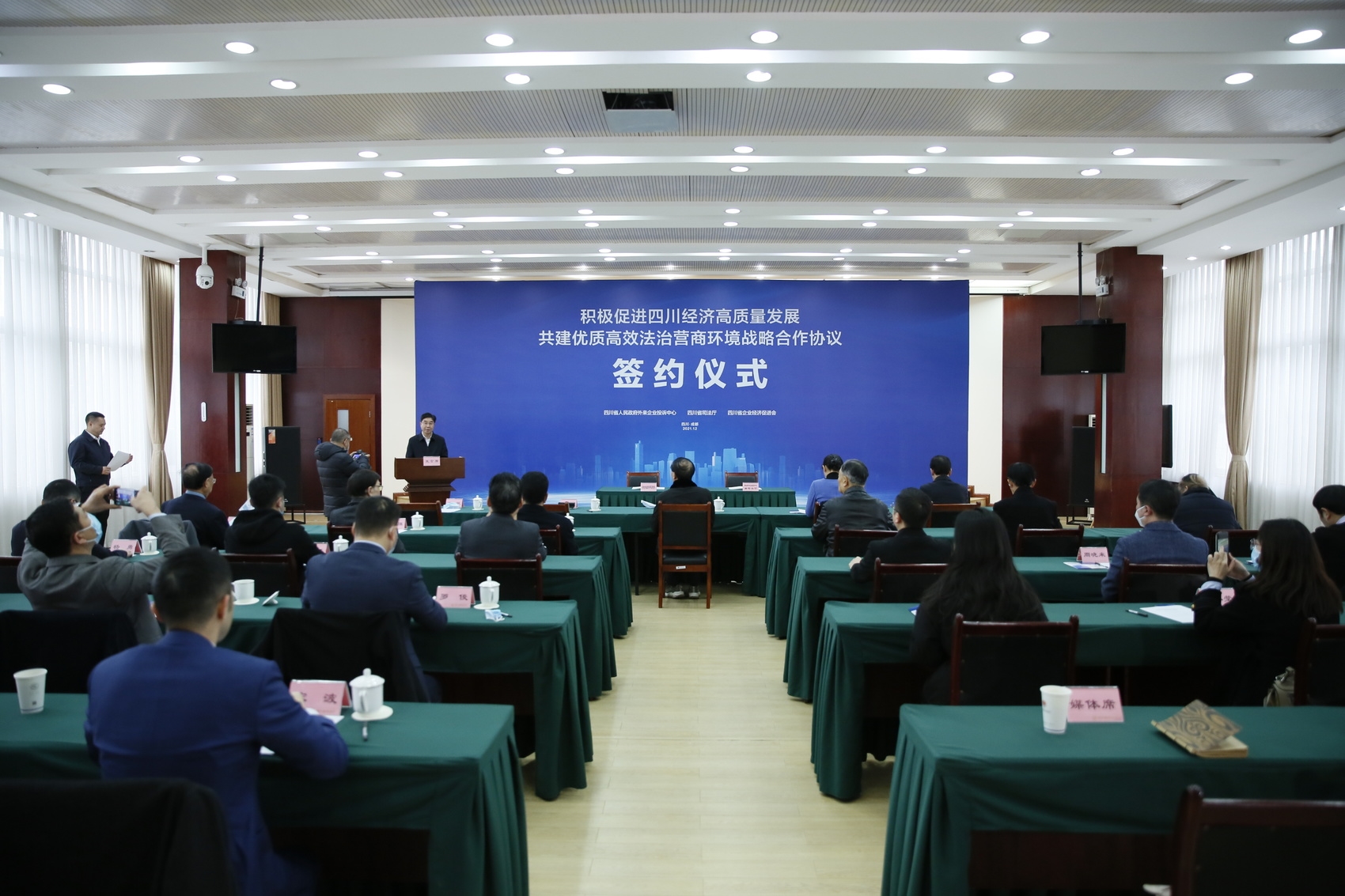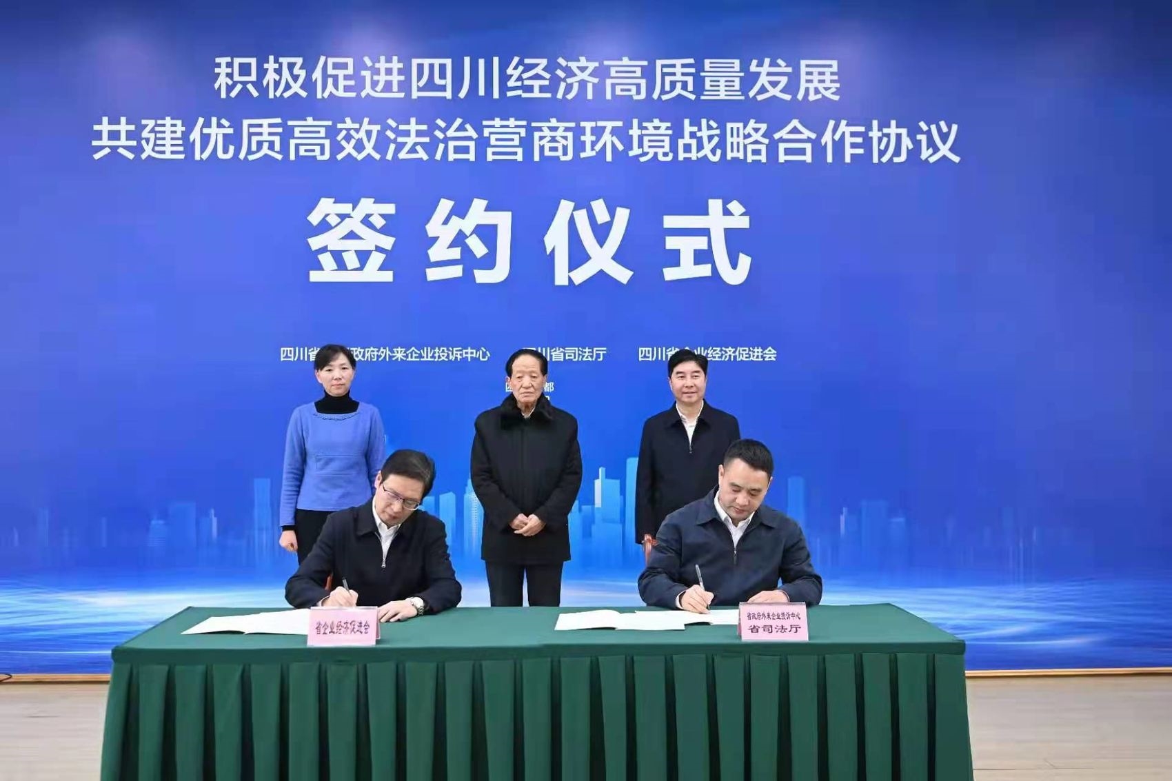 12月17日,省政府外来企业投诉中心、省司法厅、省企业经济促进会举行《积极促进四川高质量发展,共建优质高效法治营商环境战略合作协议》(下称《协议》)签约仪式,加强在维护企业合法权益、化解涉企矛盾纠纷、搭建政企沟通平台、优化法治营商环境等方面的深度合作,共同维护在川企业的合法权益,为在川企业和经营者创建优质高效的法治营商环境。